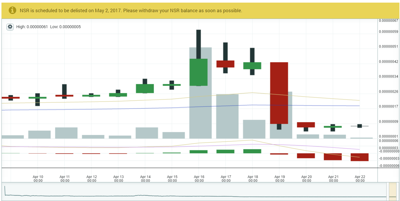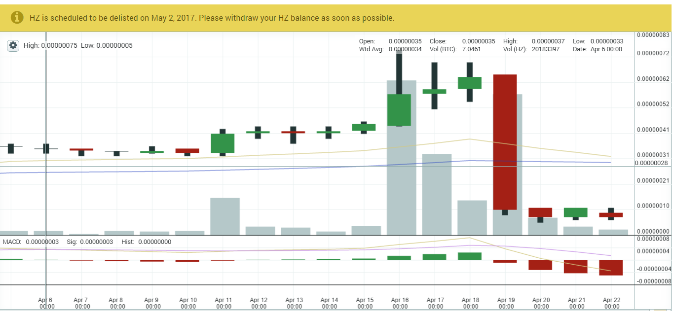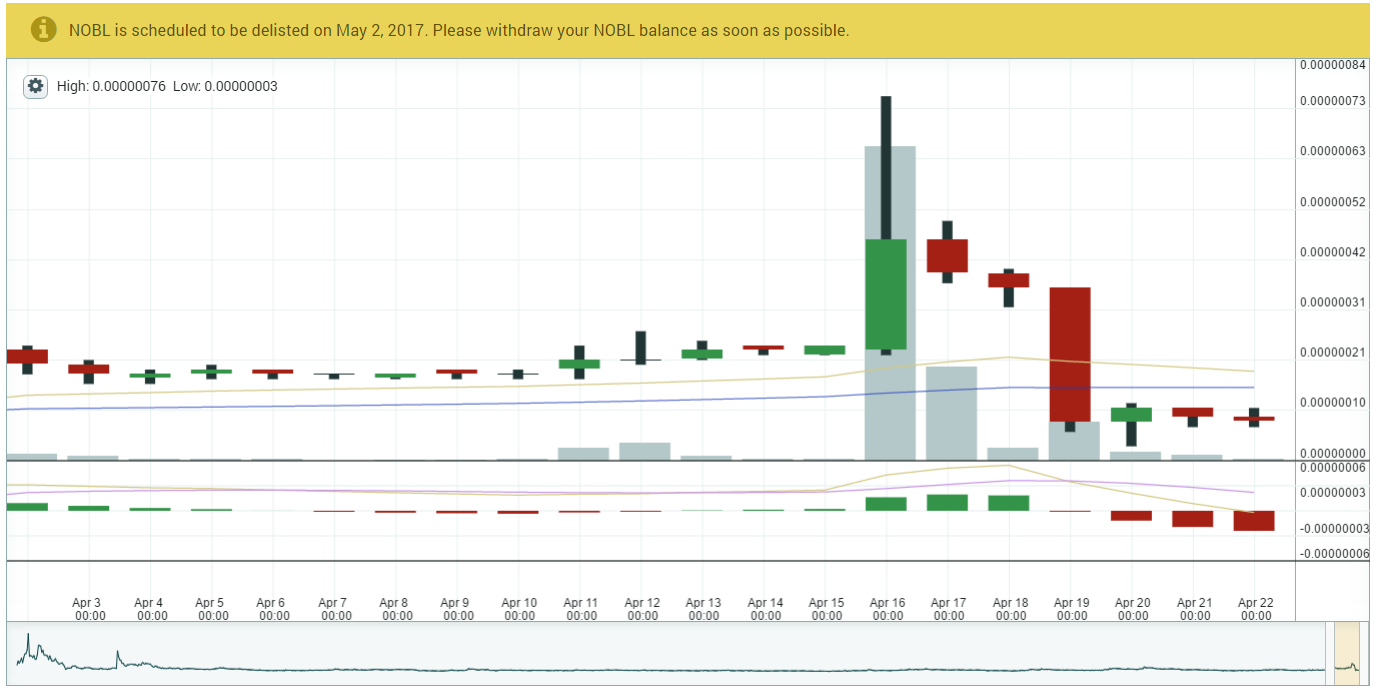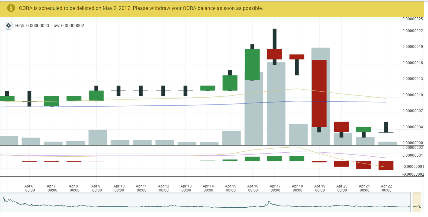 On May 2, 2017, the following will be delisted: BBR, BITS, C2, CURE, HZ, IOC, MYR, NOBL, NSR, QBK, QORA, QTL, RBY, SDC, UNITY, VOX, XMG