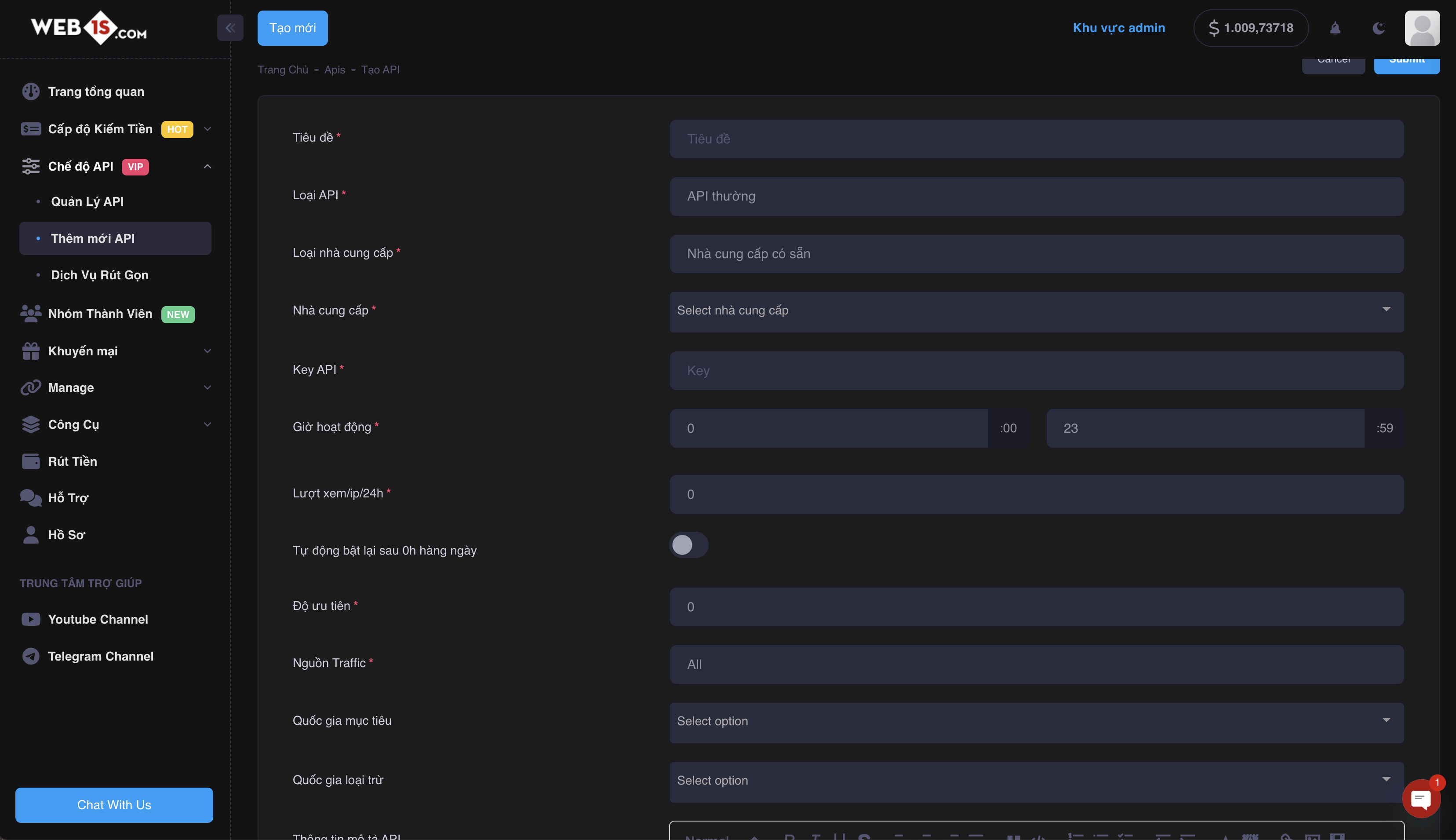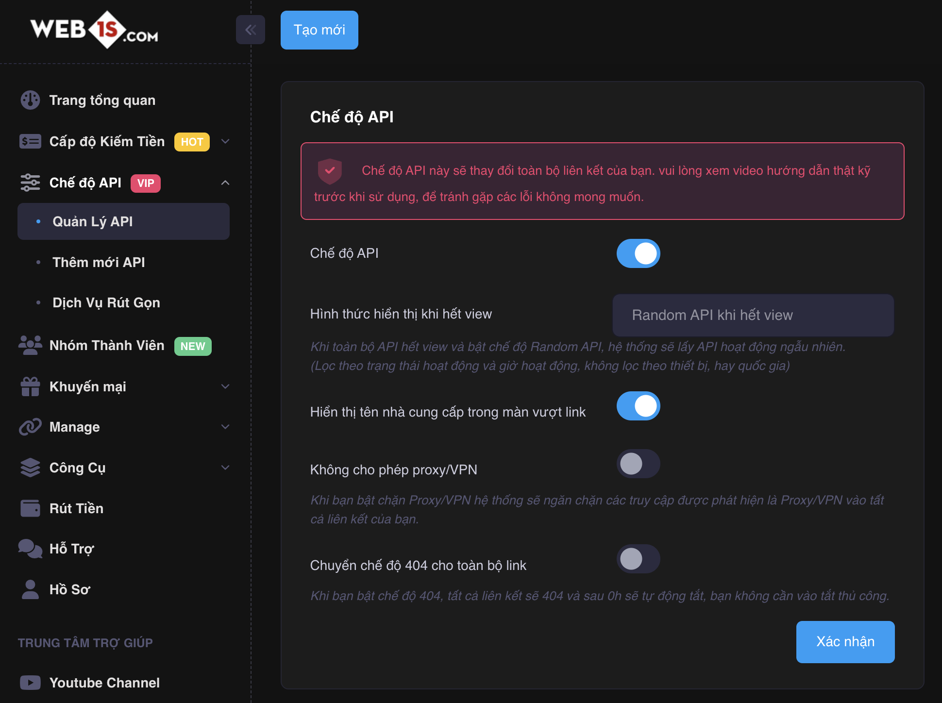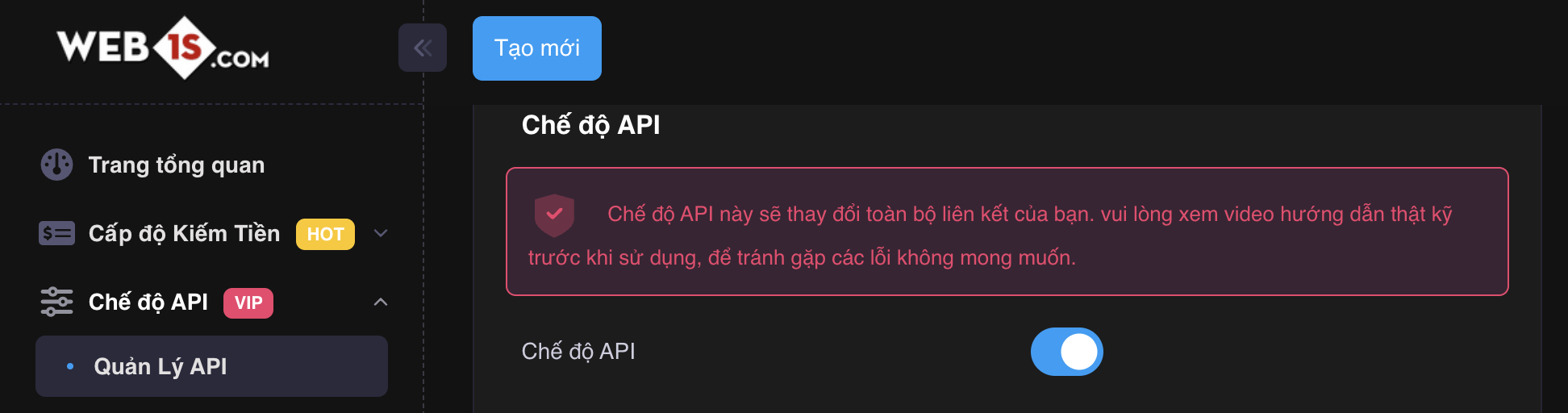 Lưu ý: Chế độ API là quản lý và được sử dụng hoàn toàn miễn phí 100%, bạn không phải kiếm tiền trên Web1s, nên không có chuyện Web1s scam hay lừa gì cả. Hãy đọc qua các hướng dẫn trước khi sử dụng ^^!.