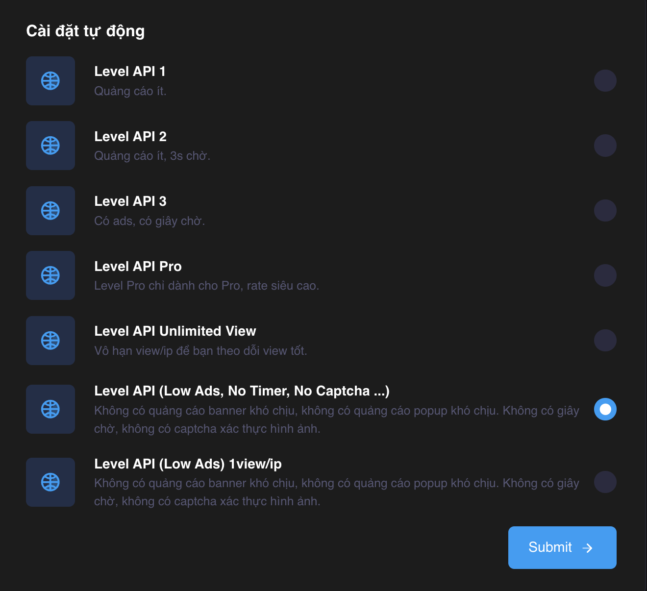 Đây là loại level không quảng cáo, không timer, không captcha gì cả... chỉ là sử dụng miễn phí để quản lý all các trang rút gọn khác, được hỗ trợ bởi Web1s để bạn có thể theo dỗi view, theo dỗi chart thống kê, quốc gia, thiết bị... cài đặt ưu tiên, số view/ip truy cập link của bạn và phân phối view theo cài đặt của bạn để bạn có thể dễ dàng quản lý và tăng doanh thu hơn.SỬ DỤNG 100% MIỄN PHÍ.