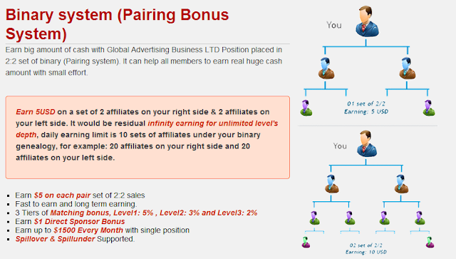 Earn big amount of cash with Global Advertising Business LTD Position placed in 2:2 set of binary (Pairing system). It can help all members to earn real huge cash amount with small effort.