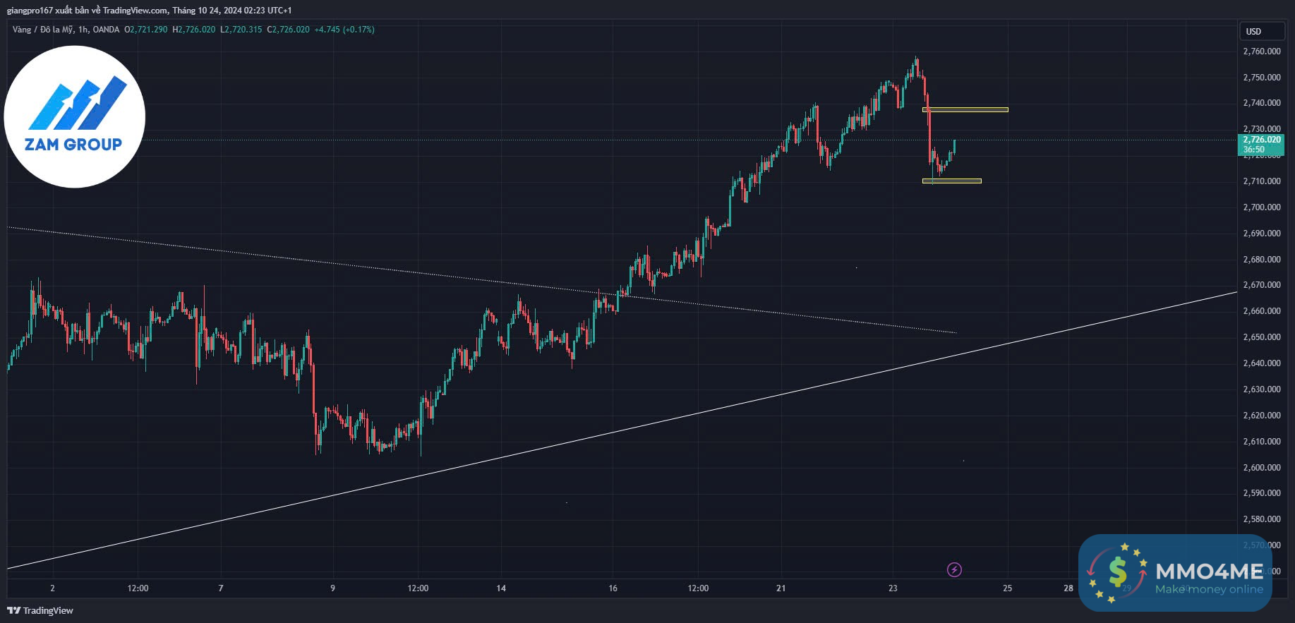 Kết thúc phiên 23/10 vàng sau khi đạt mức giá cao nhất vùng 2758 usd/oz đã có một nhịp rơi sâu về dưới giá mở của của phiên ngày hôm trước và đóng cửa ở mức 2715.3 usd/oz thể hiện xuất hiện tín hiệu lực chốt lời .Tuy nhiên với việc vàng liên tục tăng giá trong nhiều ngày thì với nhịp điều chỉnh sâu đầu tiên về vùng hỗ trợ 2715 nhiều khả năng vàng sẽ còn nhịp đẩy lên lại vùng kháng cự cao phía trên sau đó tiếp tục điều chỉnh giảm.