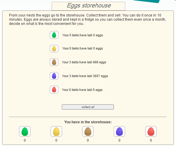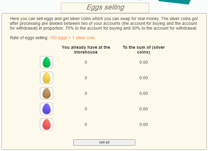 Mỗi ngày hoặc khi nào rãnh bạn cứ login vào nhặt trứng "Collect all" . Sau đó vào bán trứng nó "Sell All" sẽ quy ra lại số bạc(silver). 70% bạc mua và 30% bạc có thể rút.