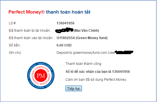 The amount of 1.5 USD has been deposited to your Perfect Money account. Accounts: U11802554->U7110840. Memo: API Payment. Withdraw to chinhitpro from greenmoneyfund.com.. Date: 16:32 08.06.16. Batch: 136095690.