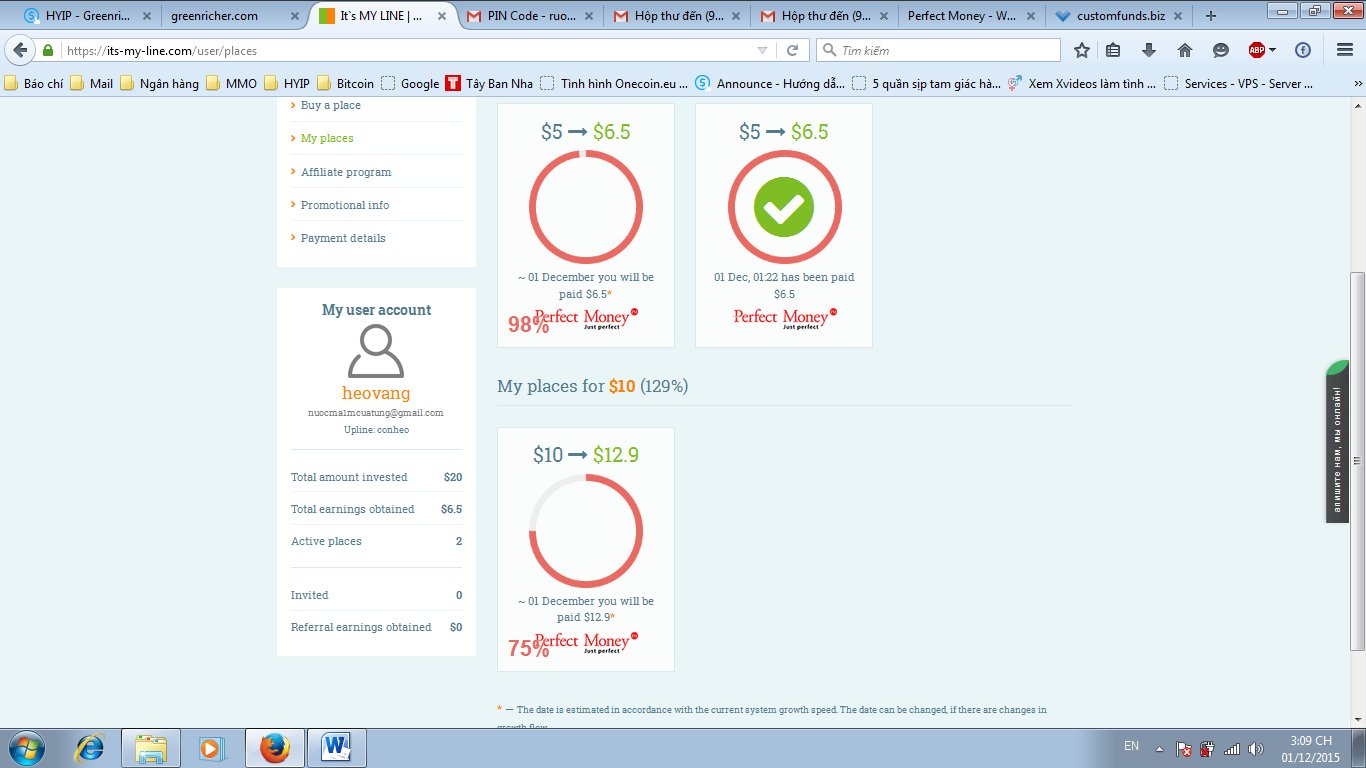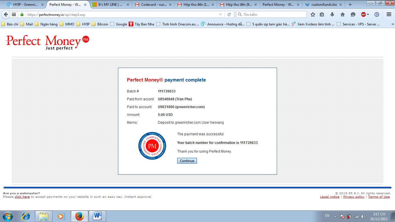 The amount of 1.9 USD has been deposited to your Perfect Money account. Accounts: U9831660->U. Memo: API Payment. Withdraw to from greenricher.com.. Date: 08:28 01.12.15. Batch: 111723800.