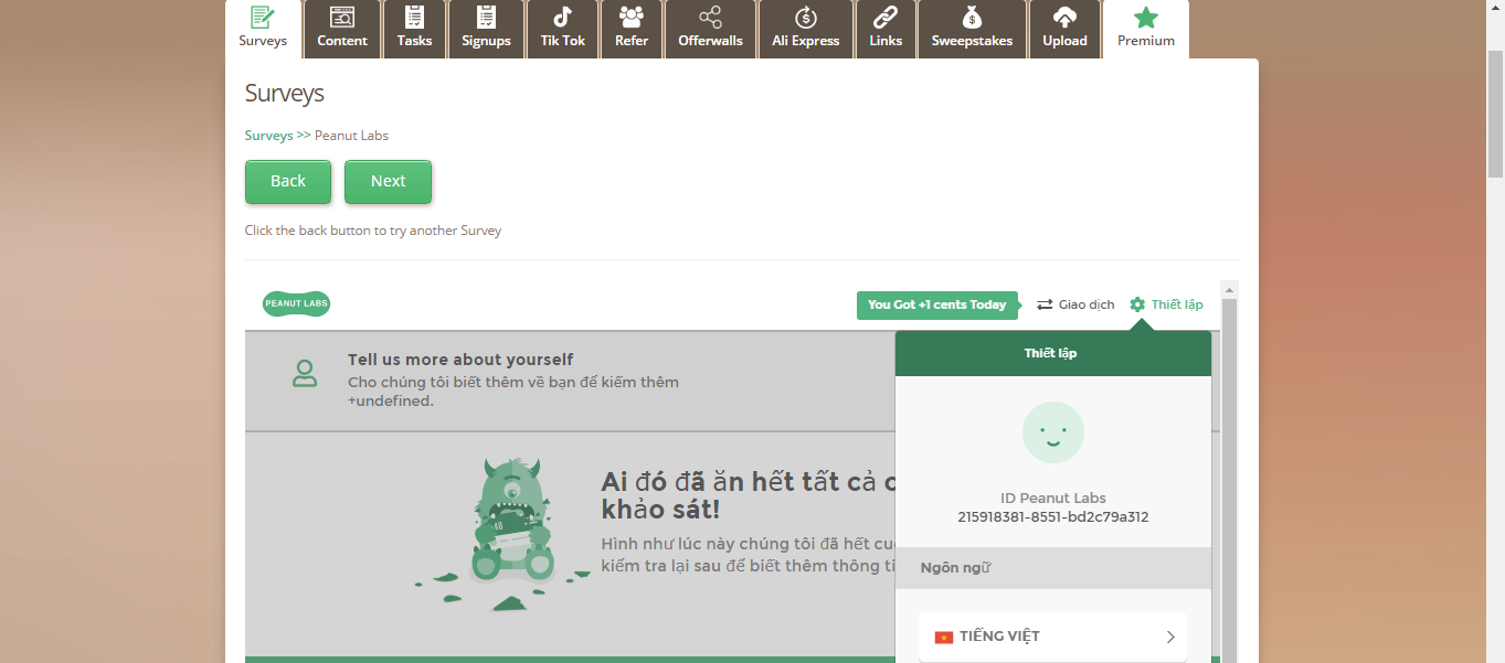 Mỗi bài khảo sát được từ 1000-4000 điểm, khi đạt 10.000 điểm thì đổi thẻ điện thoại 50.000 hoặc 2 USD thanh toán qua Paypal.