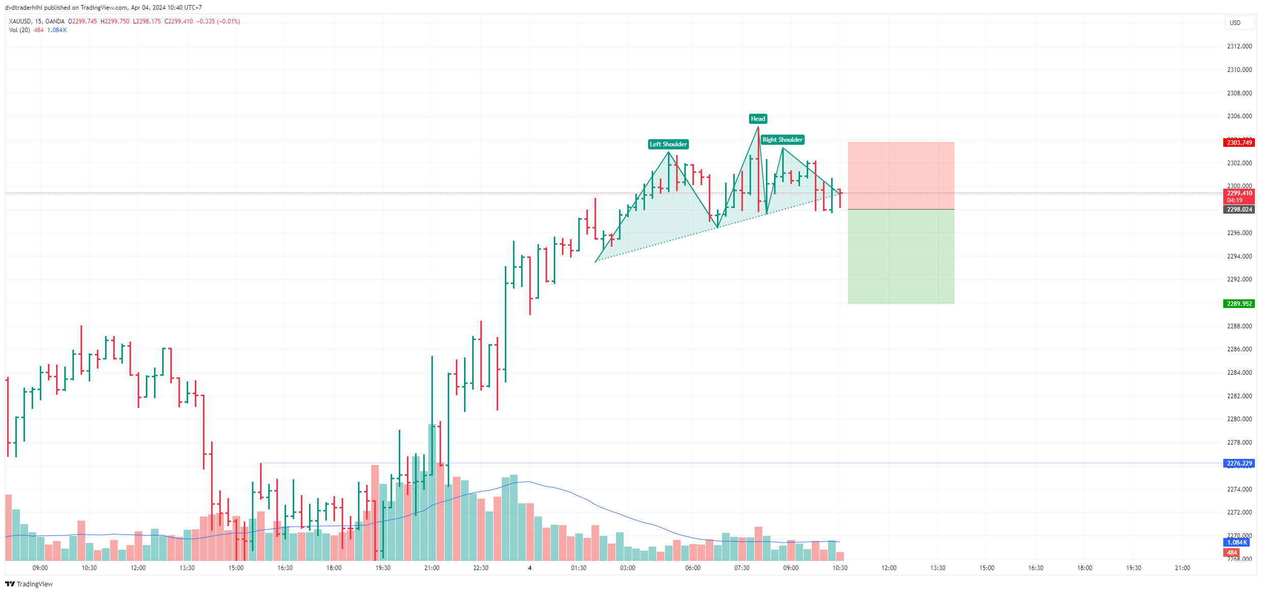 Lệnh đã close, lãi.Trade 035: XAUUSD, vai đầu vai, 4/4/2024: