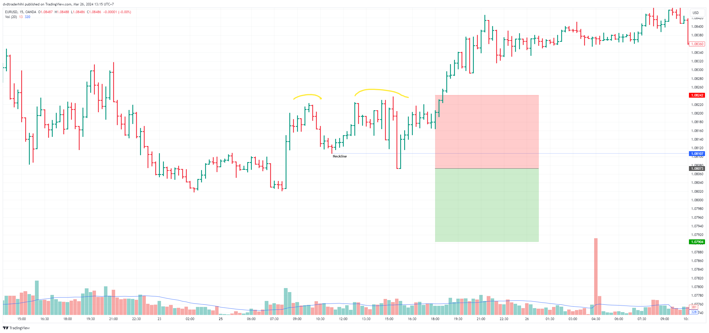 Lệnh đã close, lỗ.Trade 024: EURUSD, 2 đỉnh, 25/3/2024: