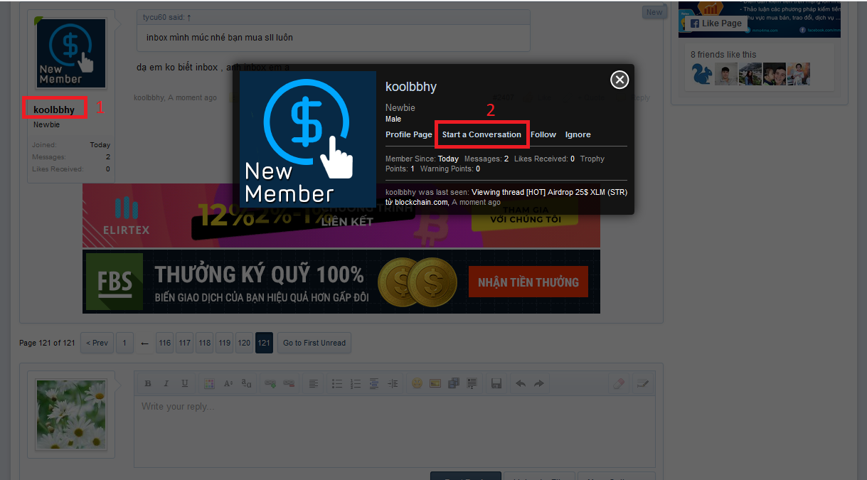 click vào nick rồi Start a Conversation. Xem hình nhé bác.dạ em ko biết inbox , anh inbox em ạ