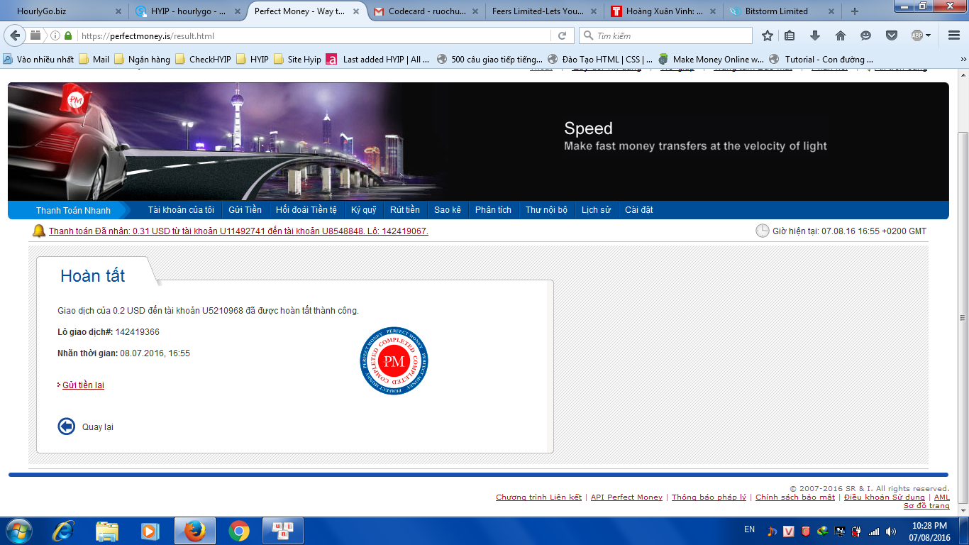 The amount of 10 USD has been withdrawn from your Perfect Money account. Accounts: U5210968->U11492741. Memo: Shopping Cart Payment. Deposit to HourlyGo.biz User Revenge.. Date: 15:59 07.08.16. Batch: 142414738.