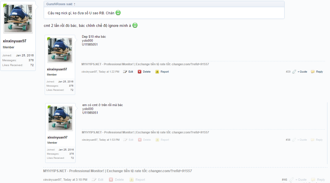 mọi người đều thấy mỗi bác ko thấy thì em biết làm sao :D bác chinhitpro đã cmt cái ảnh đấy mà bác vẫn chưa rcb :oops: còn về inbox thì hôm trước có inbox bác hỏi site hyip mà bác lặng thinh ko nói gì, thôi thì có 0.2$ em cũng ko muốn làm quá vấn đề, lần đầu cũng như lần cuối vậy :D để topic bác làm ăn :)