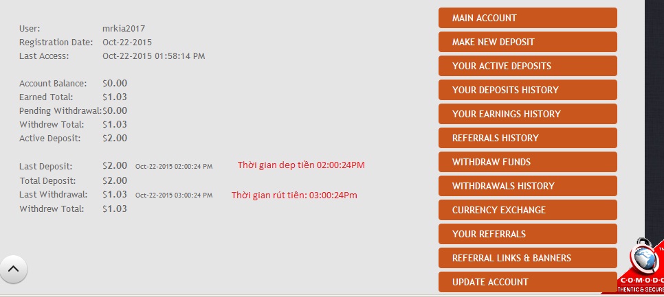 Hình như site tự động rút tiền luôn nhé! Các bạn xem hình sẽ rõ. Thời gian dep + Plan đúng y thời gian rút, không lệch đến 1 giây nữa! Cái này con người không thể làm bằng tay được. Quá pro! Vote cho Hourlytrade!!!