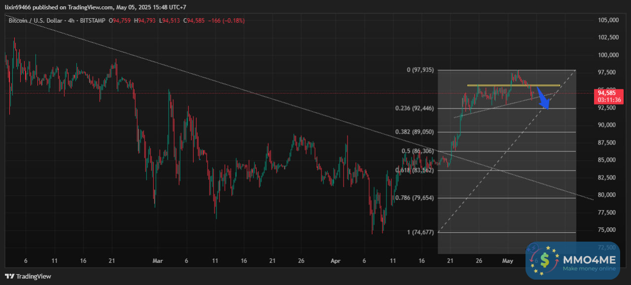 update BTC 5/05 .Xét trên khung H4 BTC đang đến vùng phân phối sau khi đạt đỉnh ngắn hạn của đà tăng quanh 98k.Tạm thời ưu tiền chờ phản ứng giá điều chỉnh về hỗ trợ thấp gần nhất canh mua sau.Dự kiến btc sẽ có nhịp test nhẹ quanh 95k sau đó tiếp tục đà điểu chỉnh về vùng 92500-9300.Các trạng thái buy nên dừng lỗ tuyệt đối khi giá lủng qua 92000.