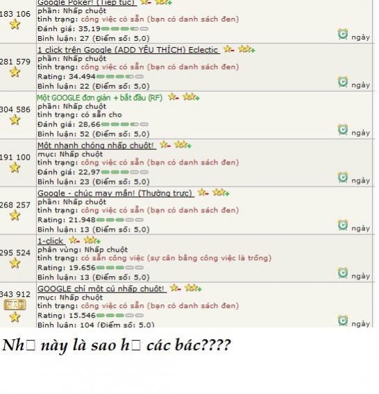 vãi các bố, một giờ các bố kiếm 1$ thì năng suất quá, lấy đâu ra chât lượng công việc, các ông tìm đến web của người ta qua search engin với một từ khóa, lại đi click vào một quảng cáo khác hoàn toàn với chủ đề, nội dung của trang web, ít thì không sao, nhiều thì google ban acc GA, nó chả cấm mới là lạ,