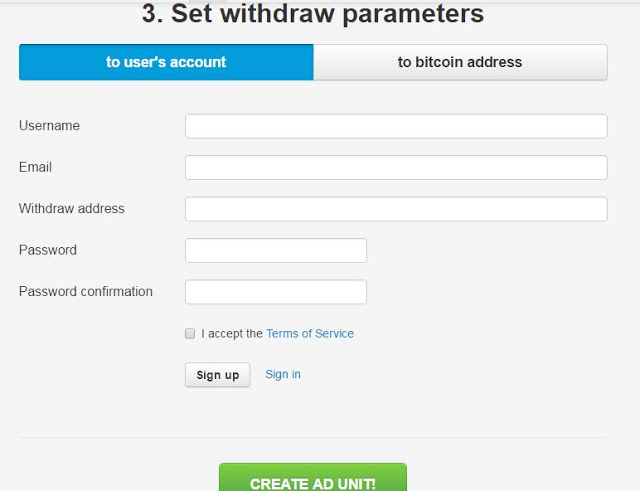 Nhập ví Bitcoin và chọn Create Ad Unit