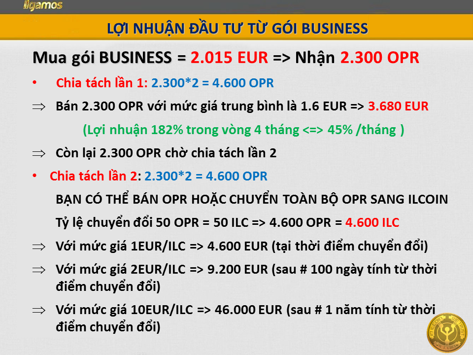 * Sau này iLcoin lên sàn giao dịch rồi (sàn nội bộ) thì ko cho giao dịch OPR nữa mà chỉ giao dịch coin với quy định tỷ lệ giao dịch cũng giống như OPR nên vẫn mua được + bán được (do vậy nếu sau này mới đầu tư thì thời gian chốt lời sẽ lâu hơn vì phải chờ chuyển đổi sang iLcoin).