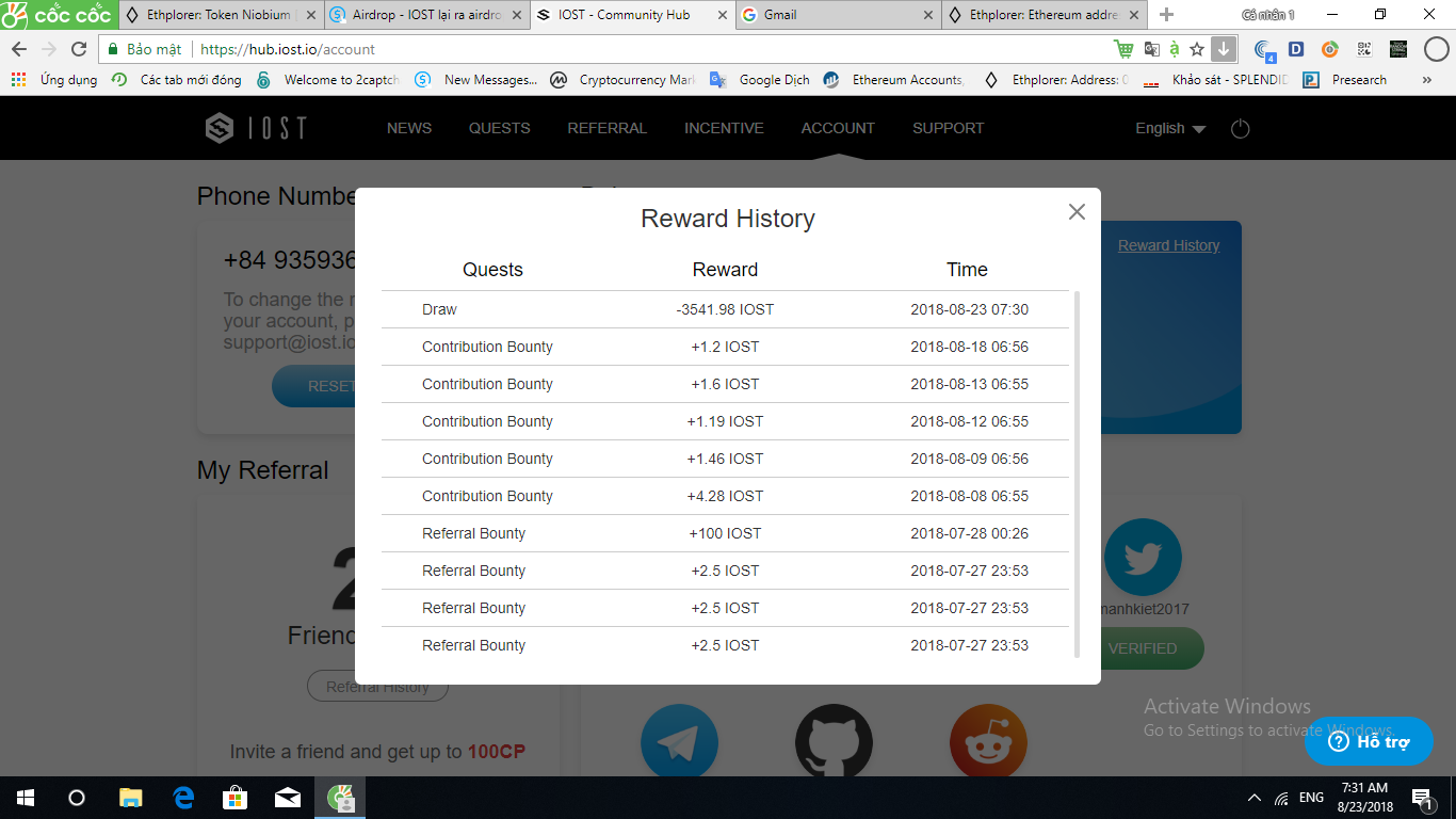 3. REMEMBER the 30-day lock up period. If you are trying to withdraw, and you see less IOST available for withdrawal than you have in your REWARDS (Balance). Remember each individual referral is time-stamped and locked for 30 days. Check your Rewards History to see a full history of your referrals. (It's on the Top Right Corner of your Blue Balance Box)