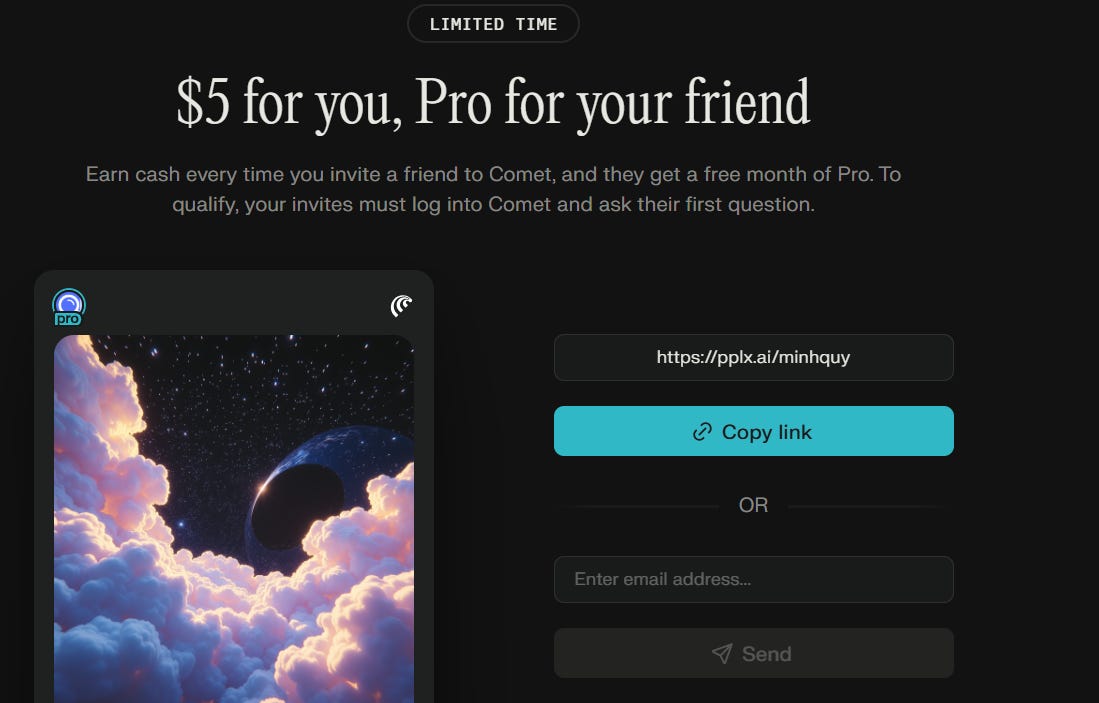 👉 Comet đang trả tiền thật (USD) cho người dùng khi giới thiệu bạn bè cài và sử dụng trình duyệt này.