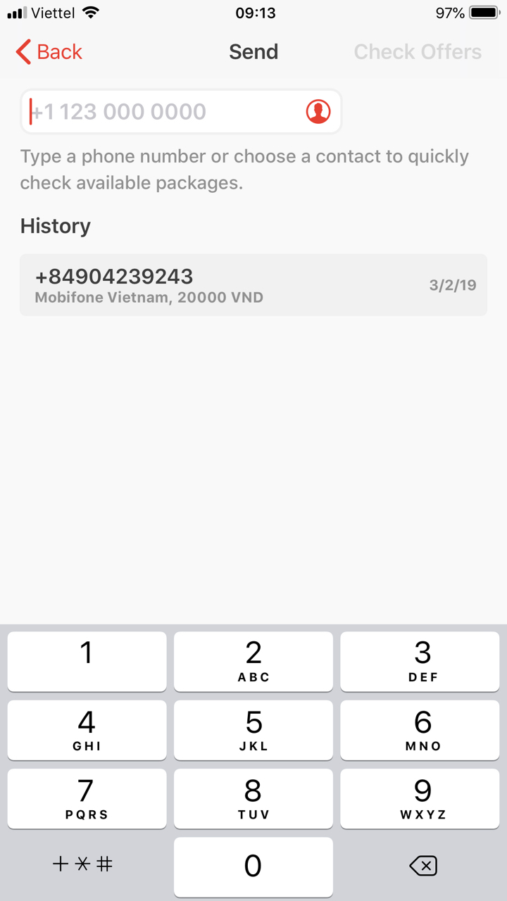 Xong quay ra màn hình chỗ Sent top-up to Nhập SDT à mà nhập định dạng +849 nhé. Đến đây là có 20k vào TK.