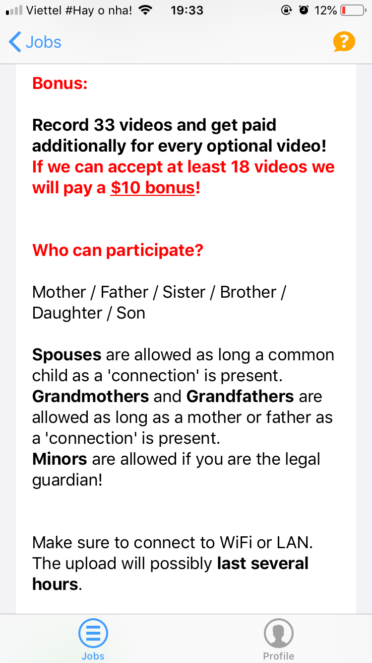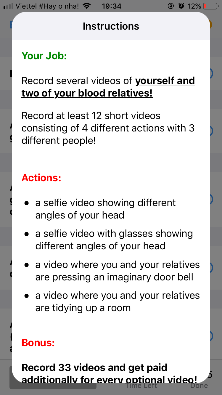 ô tải về chưa.cái nhiệm vụ đấy quay 4 cái video tầm 30s 1 cái x 3 người = 12 video.làm qué gì đến 30'.tại mới làm chưa quen thì quay lại 1 2 cái mới mất tầm đấy nhé .Muốn kiếm thêm tiền thường thì quay ít nhất 18 cái video đấy là được thêm 10 euro kìa.Nó ghi rõ trong nhiệm vụ đấy