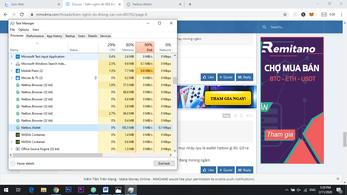Máy mình cài netbox thì lúc nào cpu cũng ăn khoảng 50%. Vào task thì mục nhảy cpu là wallet netbox gì đó. Gỡ ra thì hết. Cài vào máy khác cũng ăn cpu tương tự.