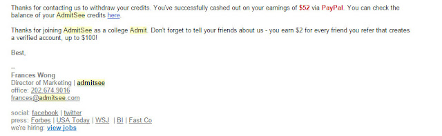 Bạn cũng kiếm được $ 2 cho mỗi người bạn mời tham để AdmitSee duyệt tiền và tiền k bị peding nhé . Người bạn gọi phải tải lên một, hợp lệ trường trung học Mỹ cá nhân hay ID đại học thì bạn mới nhận được 2 $ nhé (chính sách thay đổi )