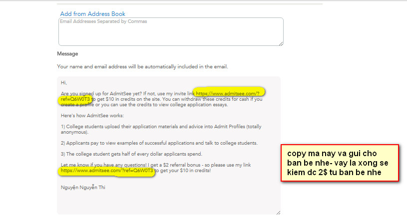 Bạn cũng kiếm được $ 2 cho mỗi người bạn mời tham để AdmitSee duyệt tiền và tiền k bị peding nhé . Người bạn gọi phải tải lên một, hợp lệ trường trung học Mỹ cá nhân hay ID đại học thì bạn mới nhận được 2 $ nhé (chính sách thay đổi )