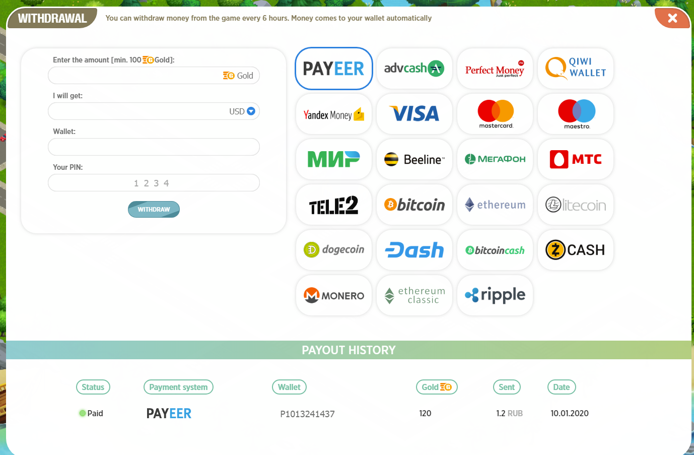 100 gold = 1 rub