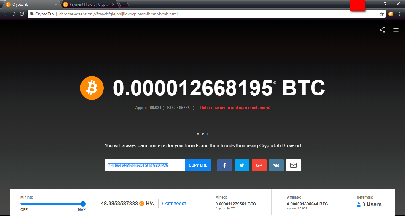 Minpay bằng sử dụng CrytoTab Browser: 0.00001 BTC