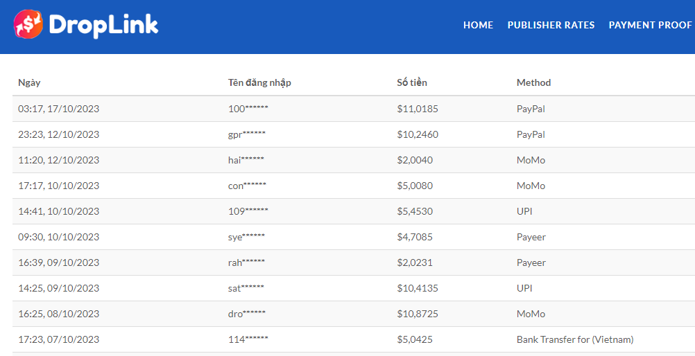 - Hỗ trợ bank tiền khá đa dạng, hỗ trợ bank (tên hình thức/ số tiền rút tối thiểu): Momo/2$; Bank Việt/5$; WebMoney/2$; Payeer/2$; PayPal/10$; Perfect Money/2$; ngoài ra cũng hỗ trợ bank Indonesia, India.