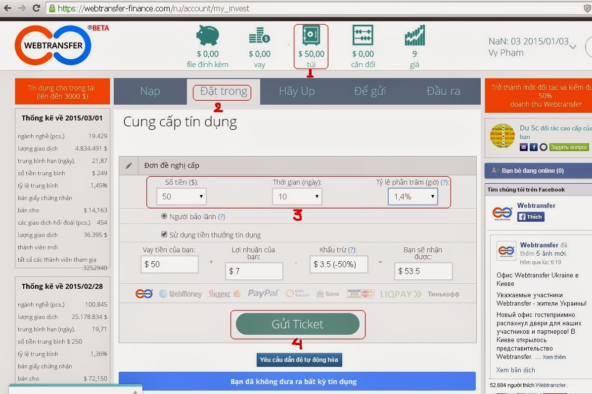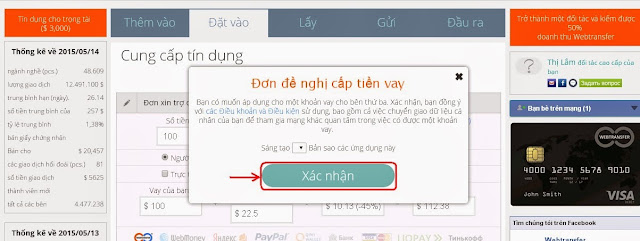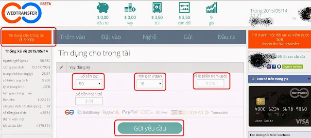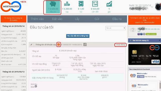 Webtransfer có tính năng rất hay là mình sẽ được vay thêm 1 khoản gấp 3 lần số tiền mình nạp với mức ưu đãi 0,5% / ngày . Mình dùng chính số tiền đó để cho người khác vay kiếm lời