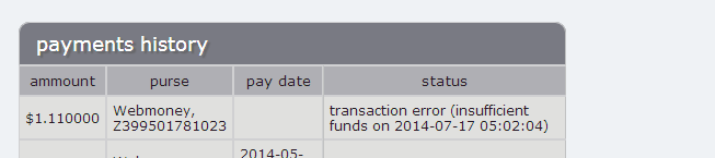 Mình đợi pay 4 acc, nhưng tiền về 2 acc còn 2 acc còn lại bị lỗi như này:transaction error (unknown error on 2014-07-16 17:32:14). Có ai biết lỗi này chính xác là nó bị gì không và nếu mình vẫn dùng WMZ này để thanh toán những lần sau liệu có ổn không? Vì WMZ này vẫn nhận được tiền 2 acc, còn bị lỗi trên 2 acc. Thank!