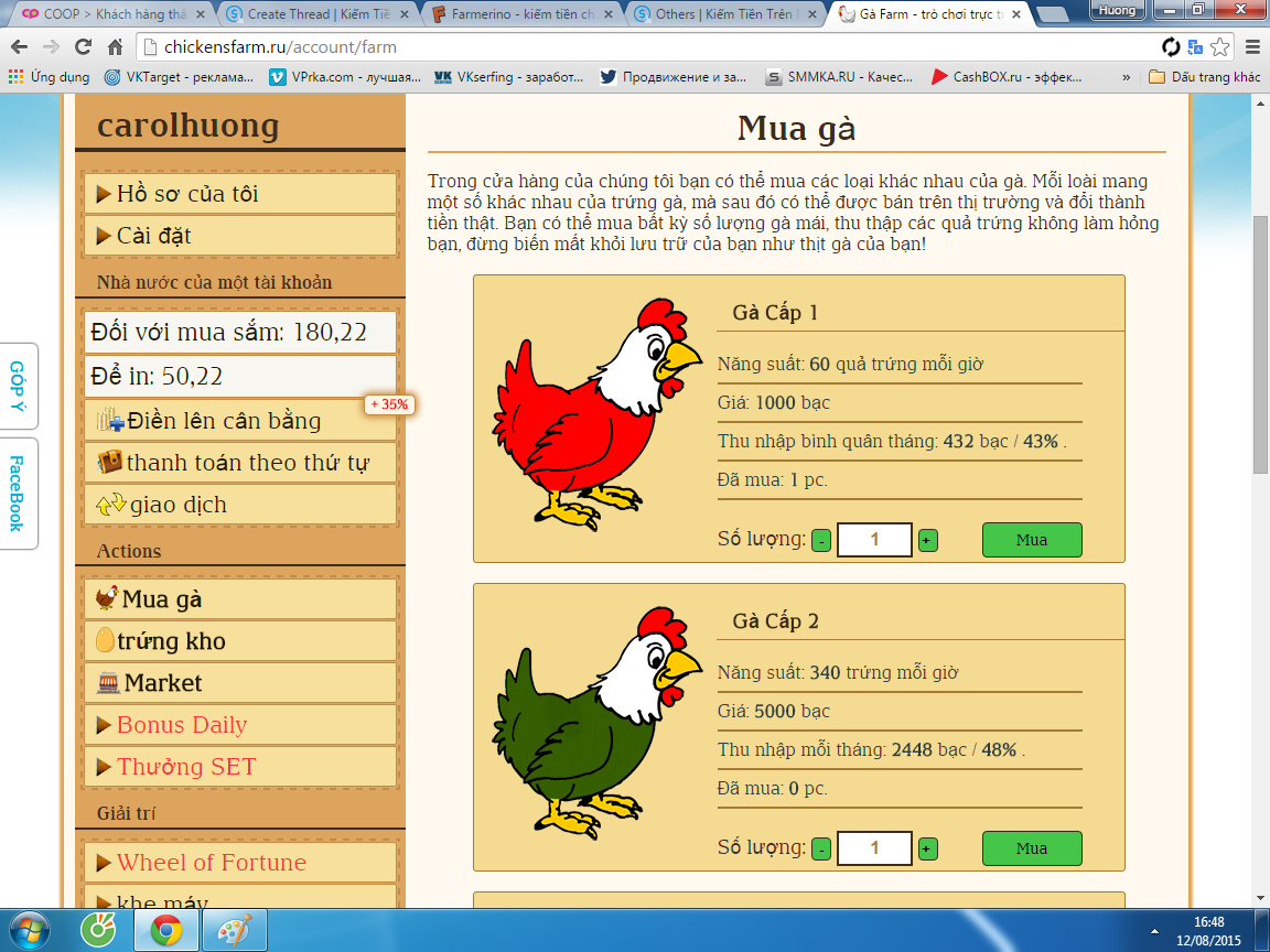 Các bác vào mua gà để nuôi và thu hoạch nhé, nhớ mỗi ngày đăng nhập để nhận bouns, cũng có thể chơi game kiếm thêm