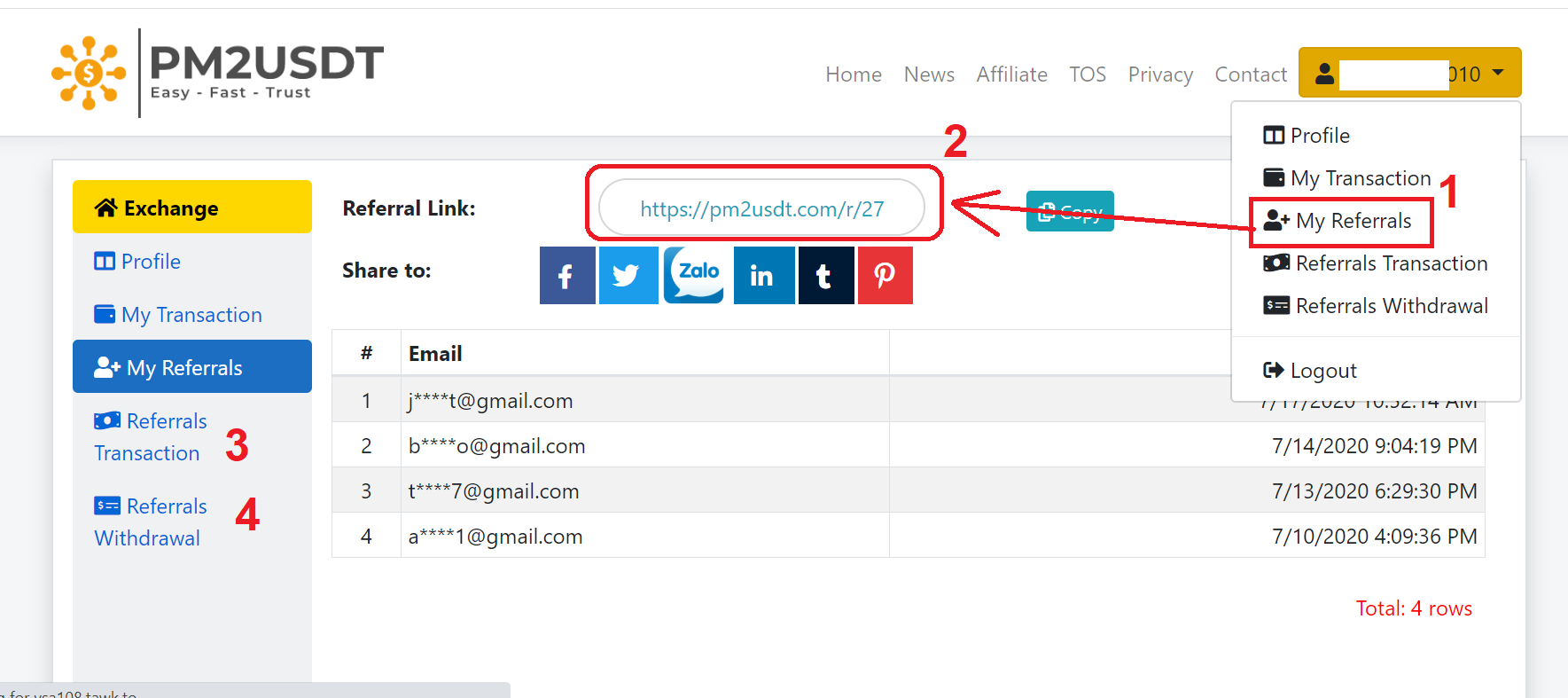 • Vào “My referrals” để lấy “link ref” và kiểm tra “khách của bạn” đã refer.