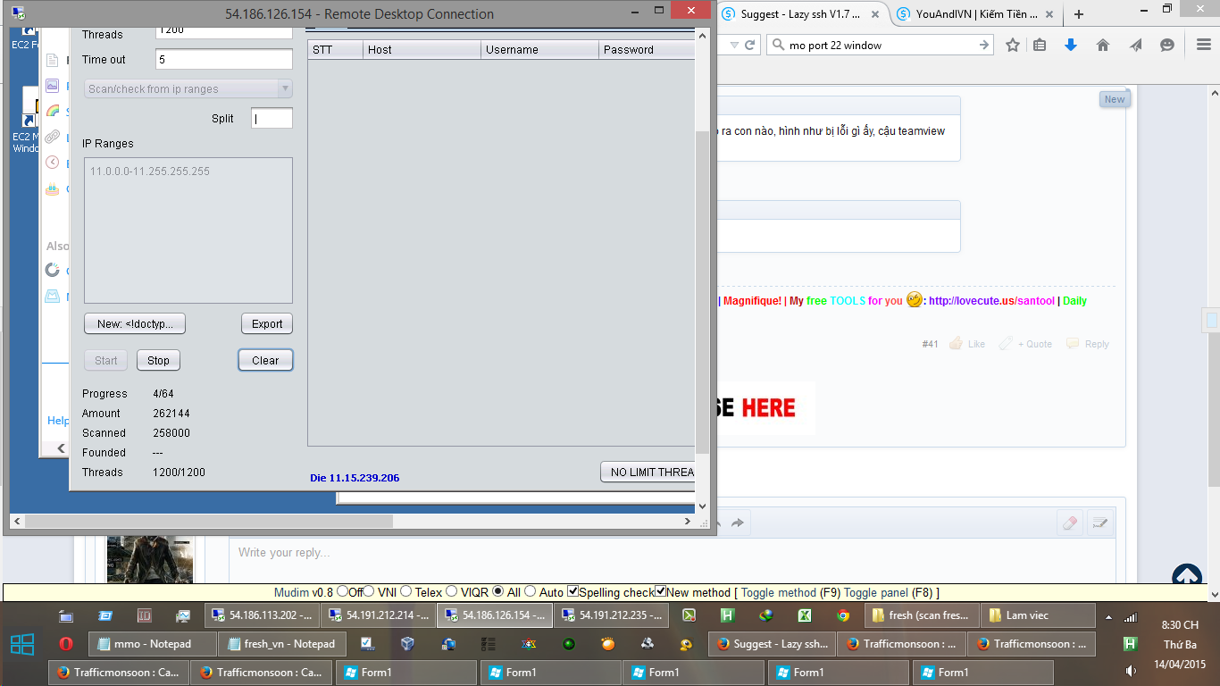 Bạn thue vps để scan ssh ở đâu vậy giới thiệu mình vớiuk thì vậy, nhưng mình scan cả ngày, thậm chỉ chọn cái ip range mà hay ra nhiều kết quả mà nó ko ra con nào, hình như bị lỗi gì ấy, cậu teamview hộ mình đc k
