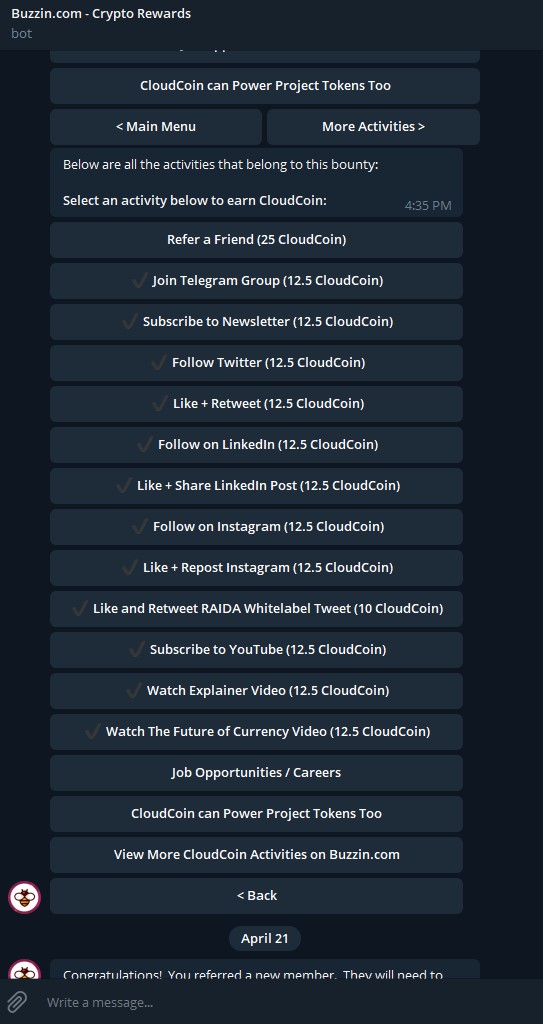 - Làm nhiệm vụ trên BOT Buzzin của Telegram để có được thông tin và hiểu về CloudCoin và cách sử dụng ví cũng như cách nó hoạt động .
