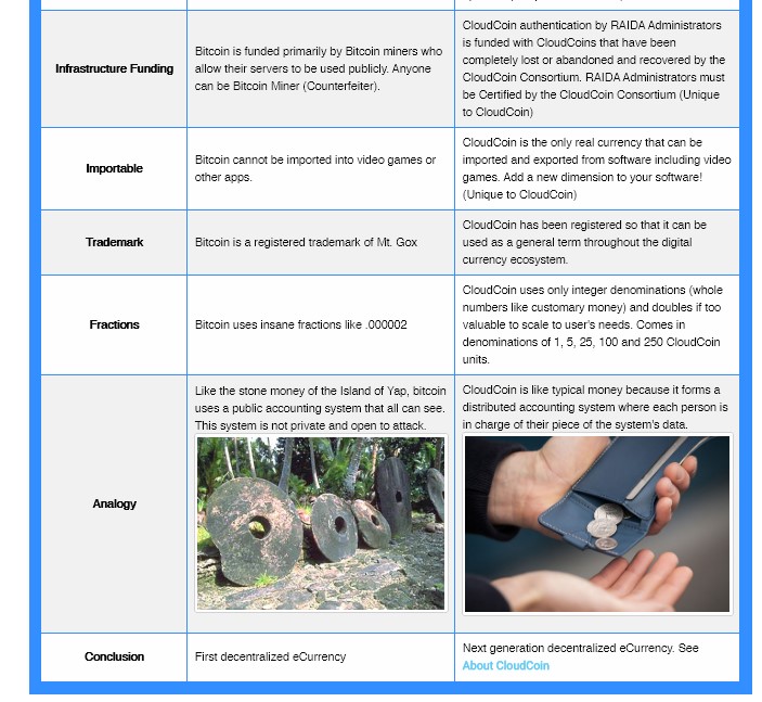 CloudCoins cung cấp một loại tiền tệ toàn cầu về mặt lý thuyết "hoàn hảo không thể bị làm giả, chi tiêu gấp đôi, bị khai thác hoặc bị mất. Các trao đổi của bạn là riêng tư 100%, không yêu cầu sổ cái công khai, tài khoản hoặc thậm chí mã hóa. CloudCoins tạo thành một hệ thống tiền tệ hoàn toàn công bằng và đạo đức và không yêu cầu phần mềm đặc biệt hoặc tải xuống, và, giống như Internet, không thể bị chính phủ, tin tặc hoặc thậm chí vũ khí hạt nhân hạ bệ.