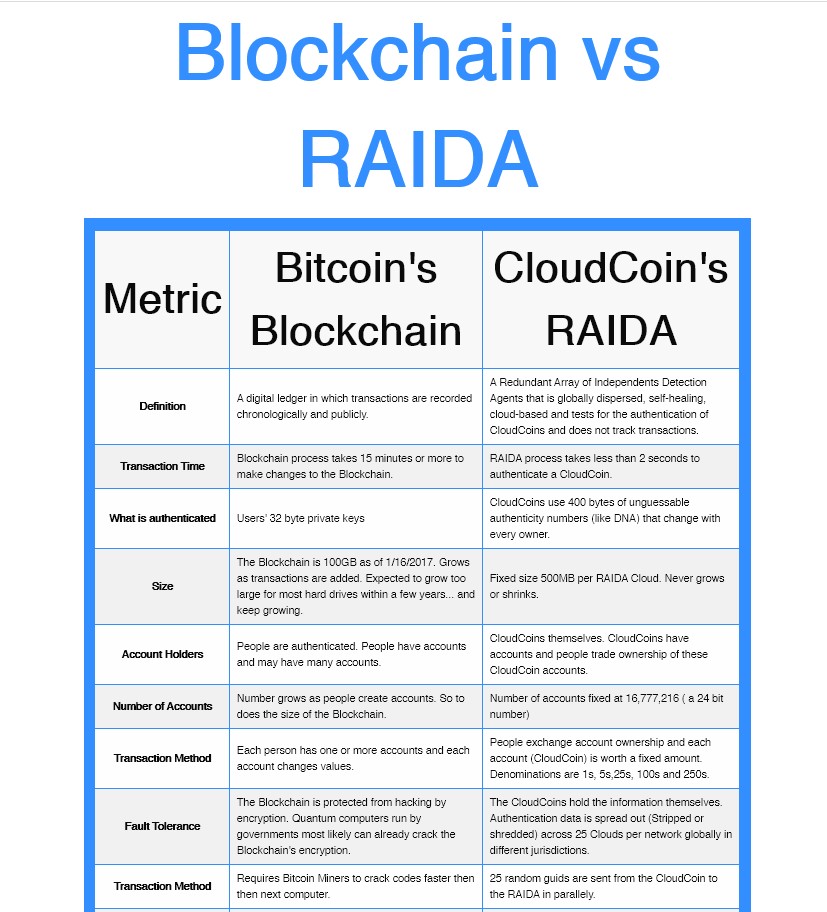 Mảng dự phòng của các đại lý phát hiện độc lập. RAIDA là một hệ thống phát hiện giả mạo toàn cầu không thể phá hủy và không thể bị giả mạo hoặc hack. Cả bom hạt nhân, tấn công sao chổi, chiến tranh thế giới, chế độ độc tài hay tin tặc chính phủ đều có thể hạ bệ RAIDA. An toàn lượng tử, tự phục hồi, đơn giản, nhanh chóng và đáng tin cậy, RAIDA có thể phát hiện tính xác thực của CloudCoin trong vòng một phần nghìn giây.