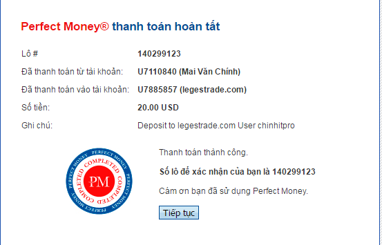 The amount of 20 USD has been withdrawn from your Perfect Money account. Accounts: U10854397->U7885857. Memo: Shopping Cart Payment. Deposit to legestrade.com User ducthuan90.. Date: 09:49 20.07.16. Batch: 140307113.
