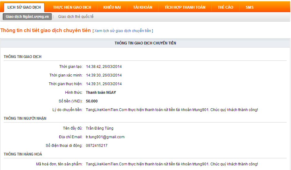 Chúc mừng member Trần Đăng Tùng ([email protected]) - Thành viên đầu tiên nhận thanh toán từ Tanglikekiemtien.com sau 1 tháng đi vào hoạt động