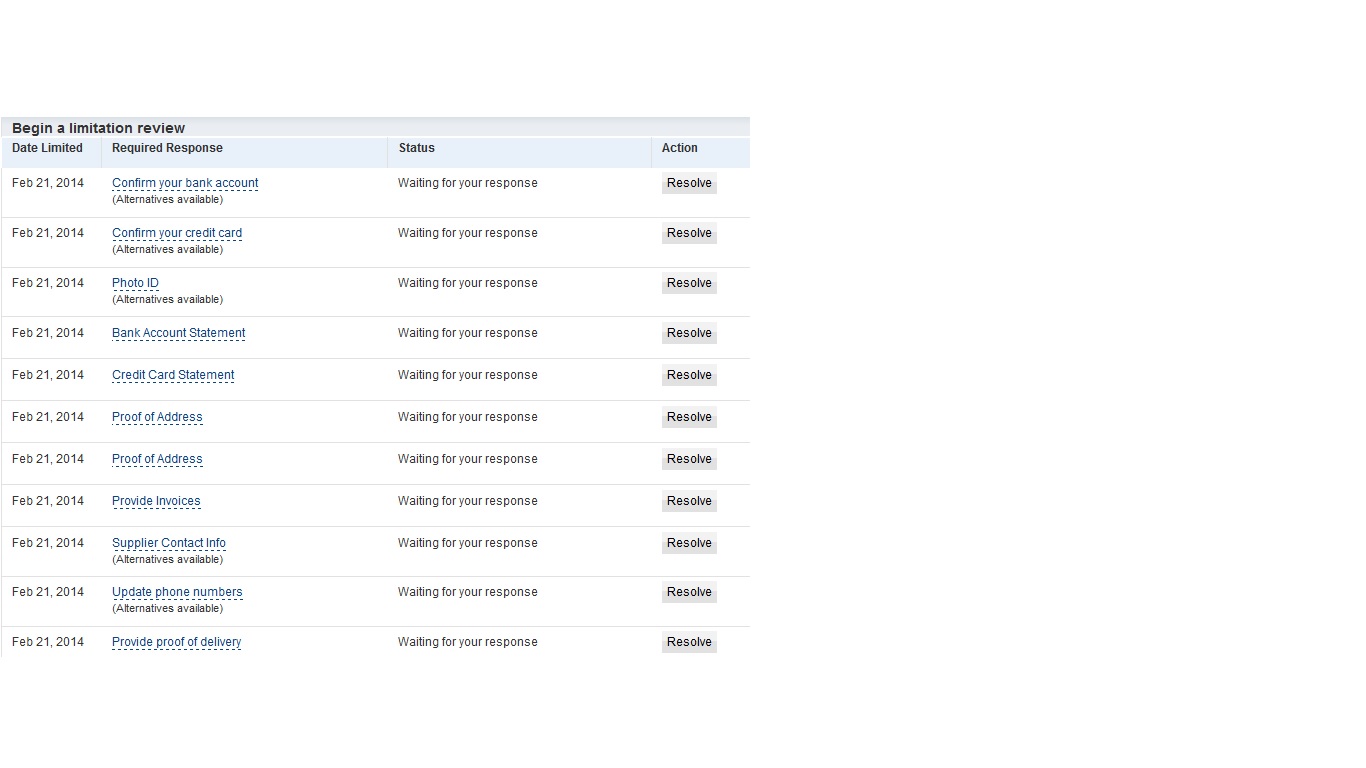 To help us with this and to find out what you can and can't do with your account until the issue is resolved, go to the Resolution Center.