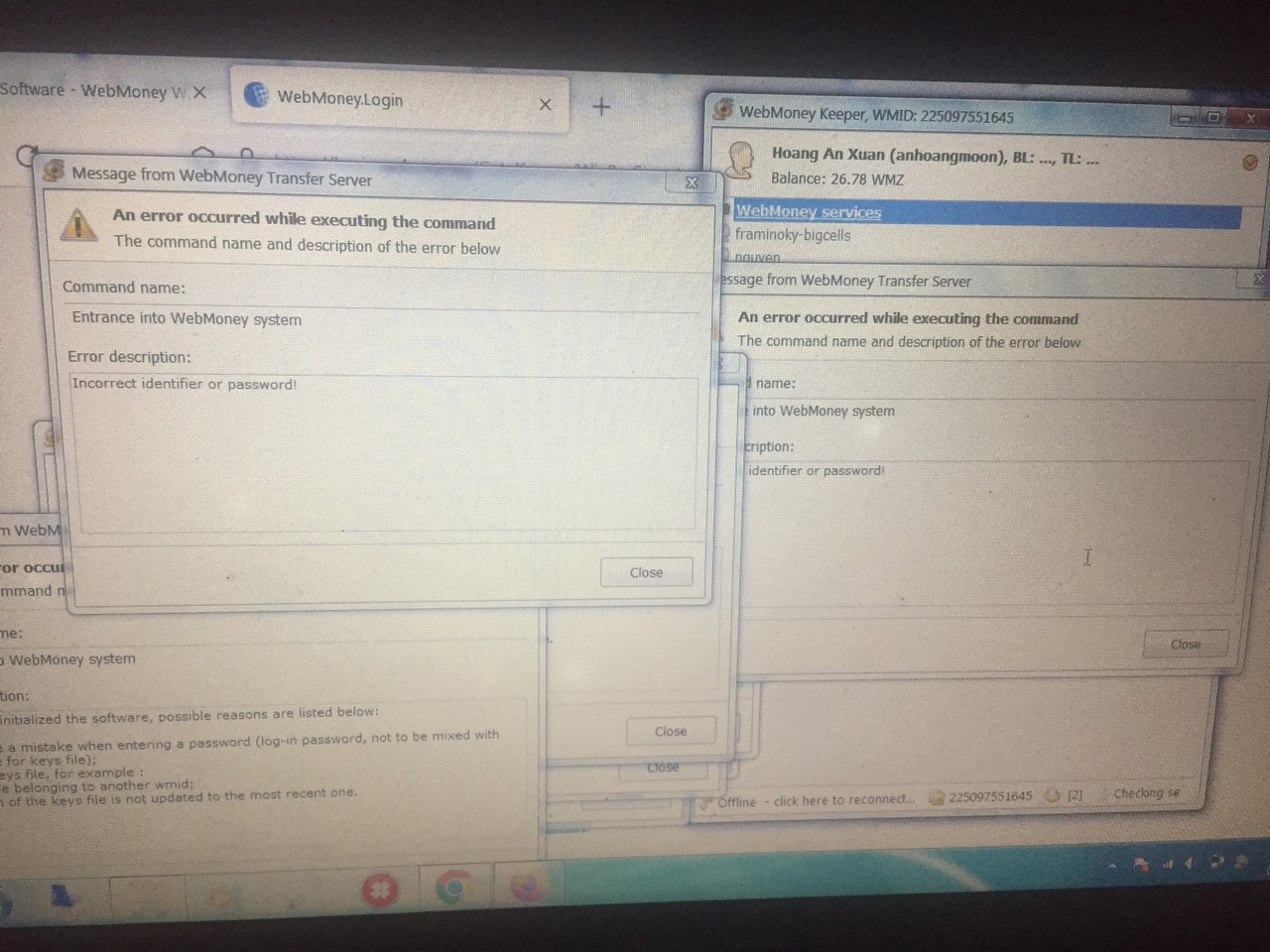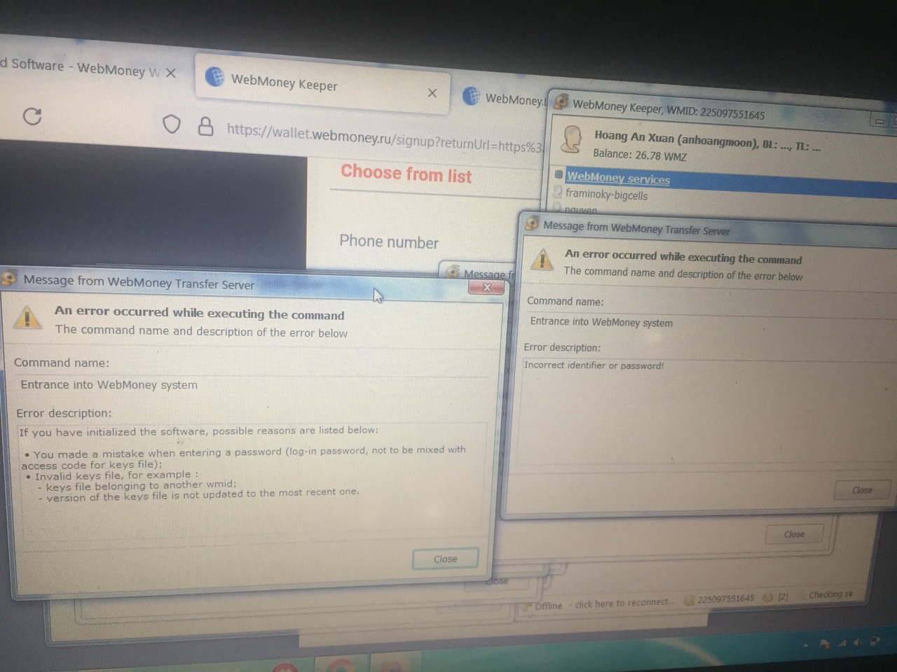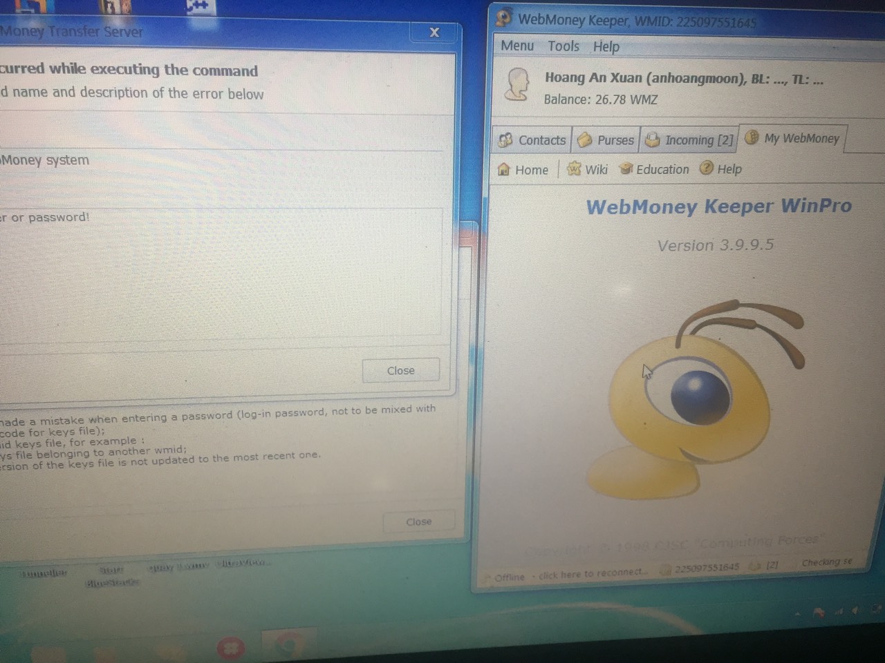 chào các bác, trương hợp của e thế này, lâu r e k sd ví wmz, hôm nay mò cả buổi sáng ko ra , nên lên đây hỏi xem cách fix, e có cái app webmoney pc login đúng mk thì mới cho vào, nhưng vào thì ko sd dc, bản cũ update, e update thi login web lại báo ko tồn tại ví, nghiaz là cái wimd của e ko đúng or die, bây giờ e phải làm thê nào ạ, xin cám ơn