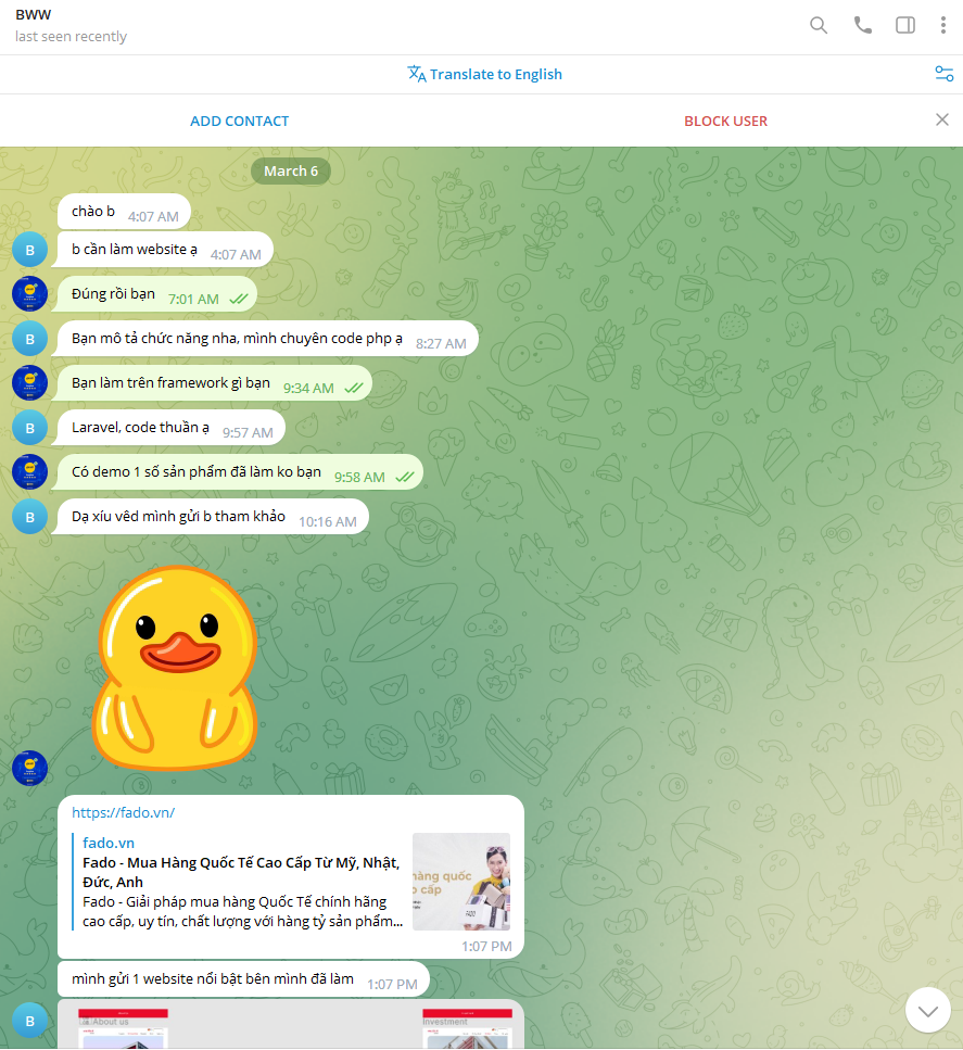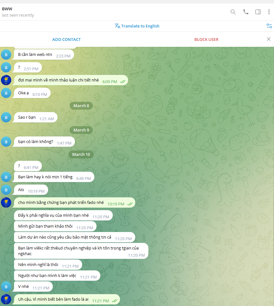 Còn anh em ở đây search profile BWW hay telegram của nó sẽ thấy topic nào nó cũng nhảy vào, thể loại code nào nó cũng chơi, sản phẩm nào nó cũng nhận là của nó =)) Pro Coder vậy mà rảnh vãi suốt ngày la liếm tìm khách hàng =)) Mùi vãi cả ra mà vẫn có nhiều đứa clone nick vào hà hơi hít hít thở thở =))