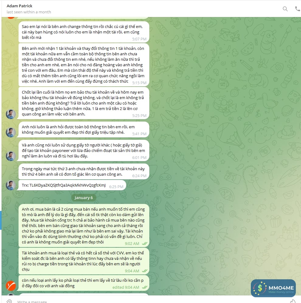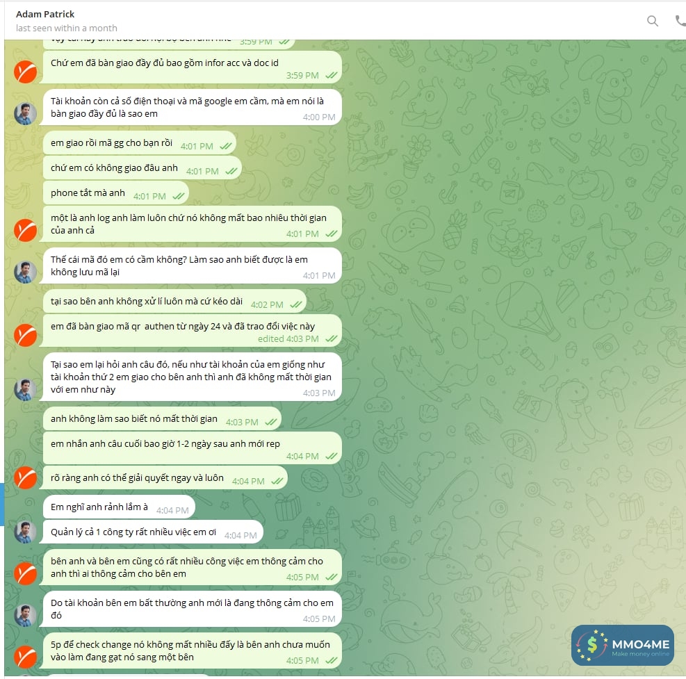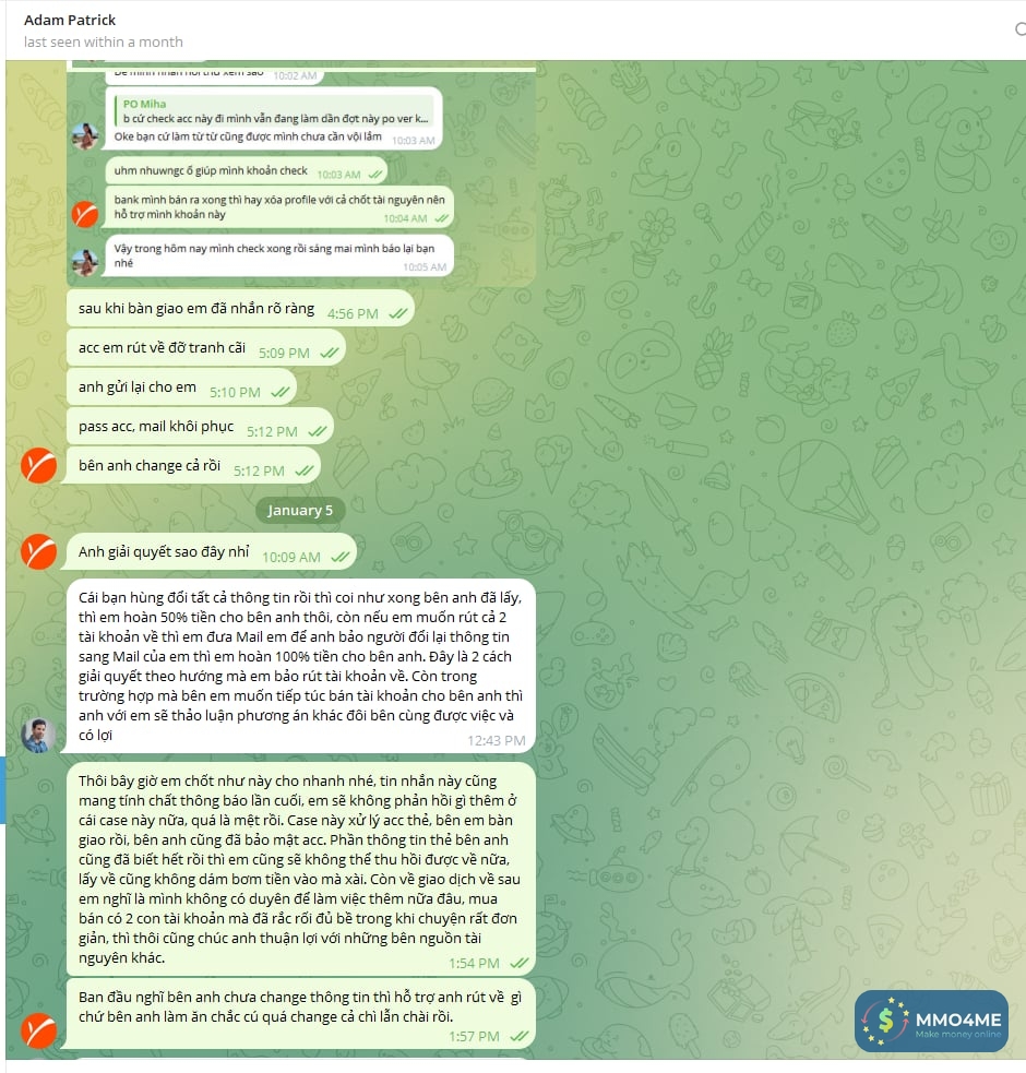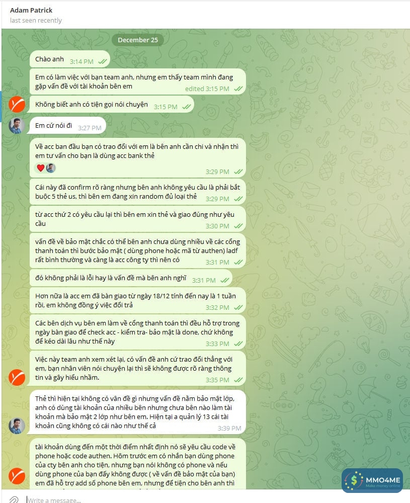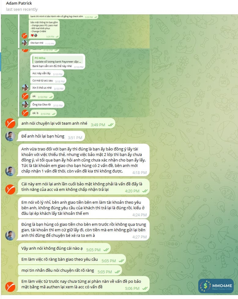 Để em gửi nguyên văn cuộc trò chuyện xem bên nào đúng sai anh nhé bên kia cắt xén nội dung cũng chẳng có gì , em làm việc với bên này cũng như support hết mức rồi. Mua có cái bank thôi kéo dài cả nửa tháng mà bình thường chỉ bảo hành login check acc thôi. Không may có 1 acc bị bật 2fa em cũng đã nói rõ là nền tảng ko cho tắt thì hỗ trợ change và bảo mật rồi thì cứ loằng ngoằng mãi. Tài khoản thì chả có vấn đề gì không biết là lừa đảo cái gì? Em đã hỗ trợ hết khả năng, nên từ thời điểm này em xin dừng làm việc và không muốn liên quan thêm đến vấn đề này nữa.