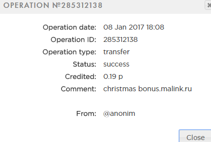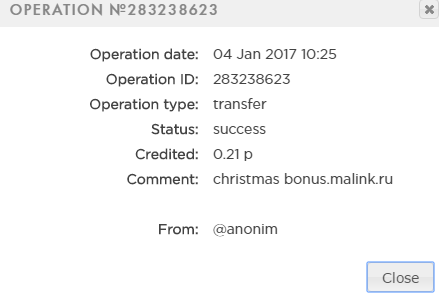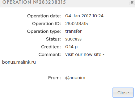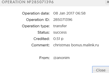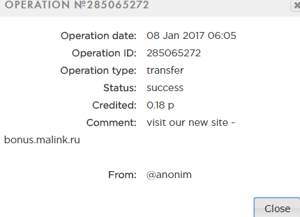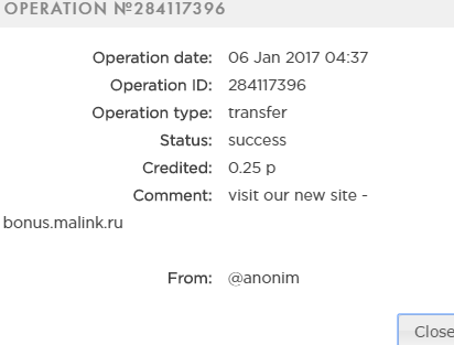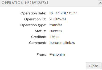Operation date: 16 Jan 2017 05:51 Operation ID: 289126741 Operation type: transfer Status: success Credited: 1.76 p Comment: bonus.malink.ru From: @anonim