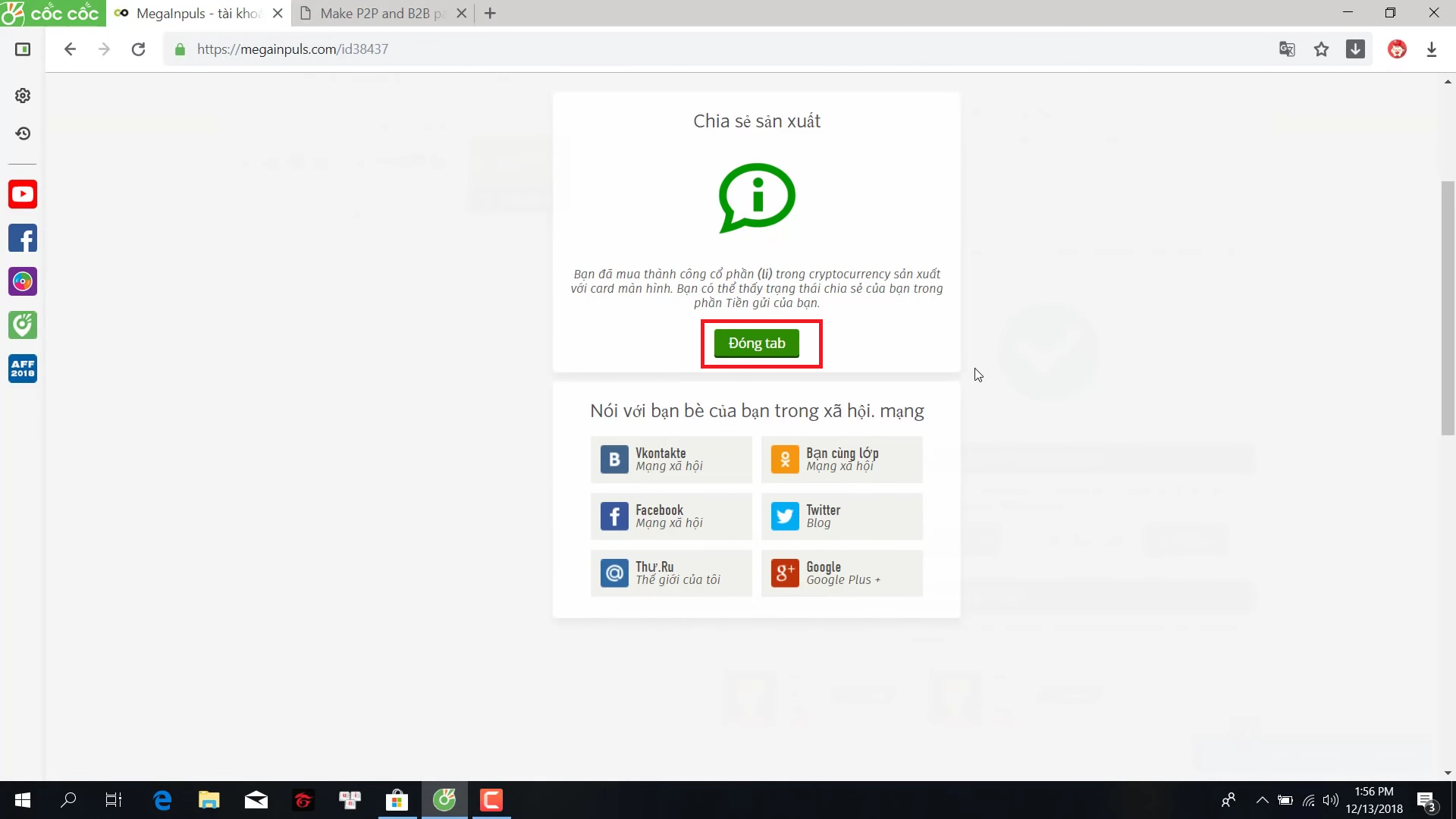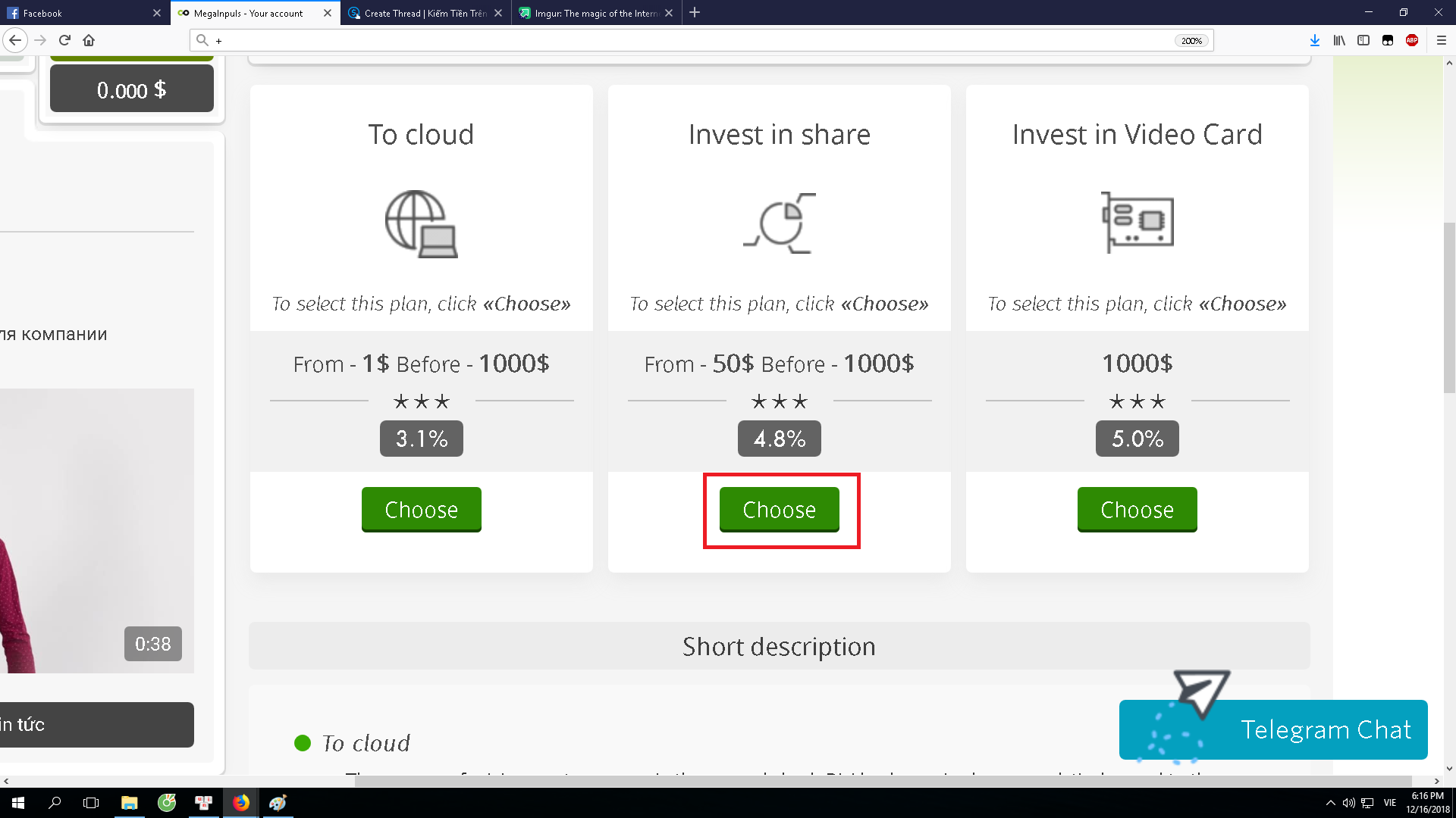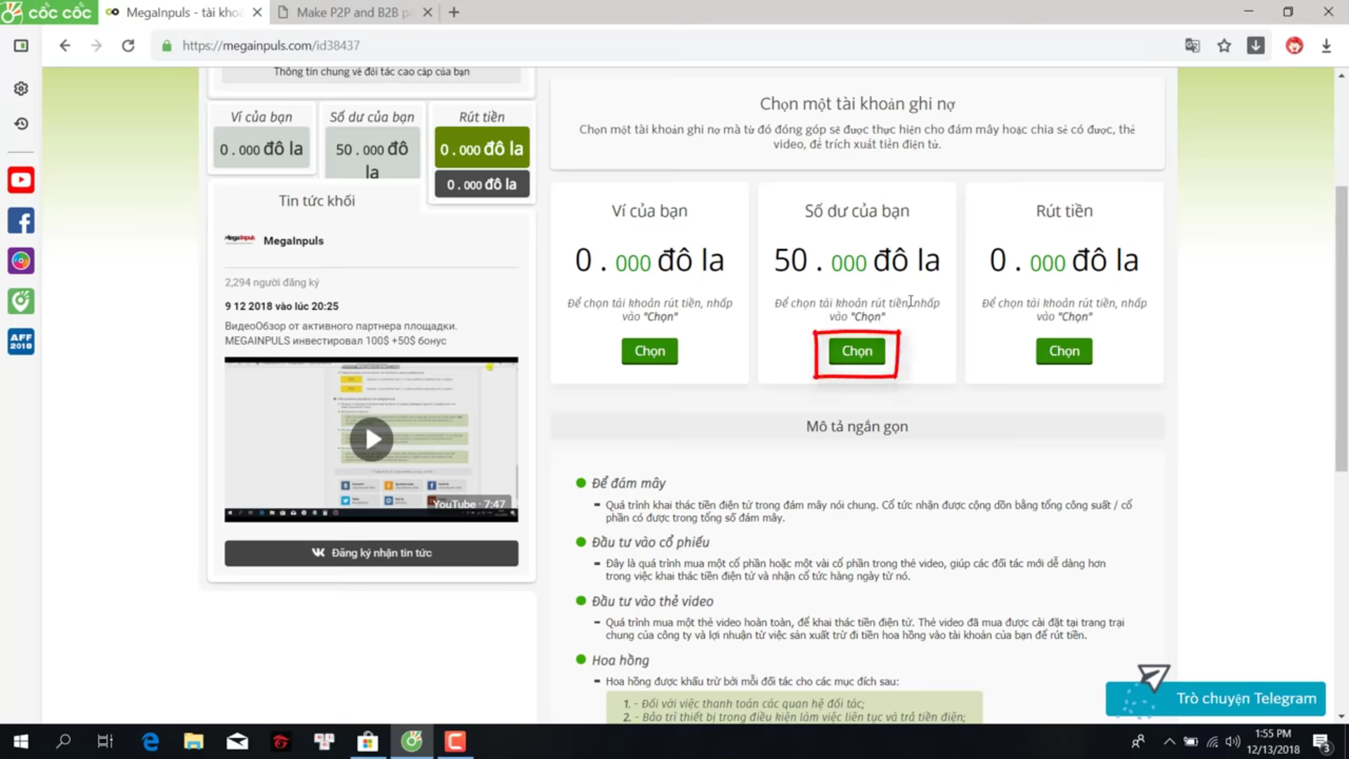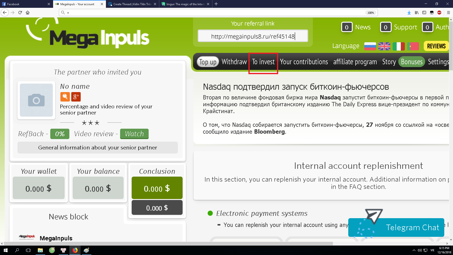 Dạo gần đây lướt Youtube thấy site MegaInpuls này đang được giới thiệu nhiều. MegaInpuls sẽ cho 50$ làm vốn và mình chỉ cần đăng kí gói 50$. Mỗi ngày sẽ lãi 0.3$ đến khi đủ 10$ trong tài khoản thì mới được rút về ví. Nếu đầu tư 1$ vào thì min rút là 0.1$ và đã có người rút về được. Các bác chỉ cần đăng kí rồi để đó, đợi đủ 10$ rồi rút là được và cái này cũng không mất mát gì nên các bác đăng kí đại :D