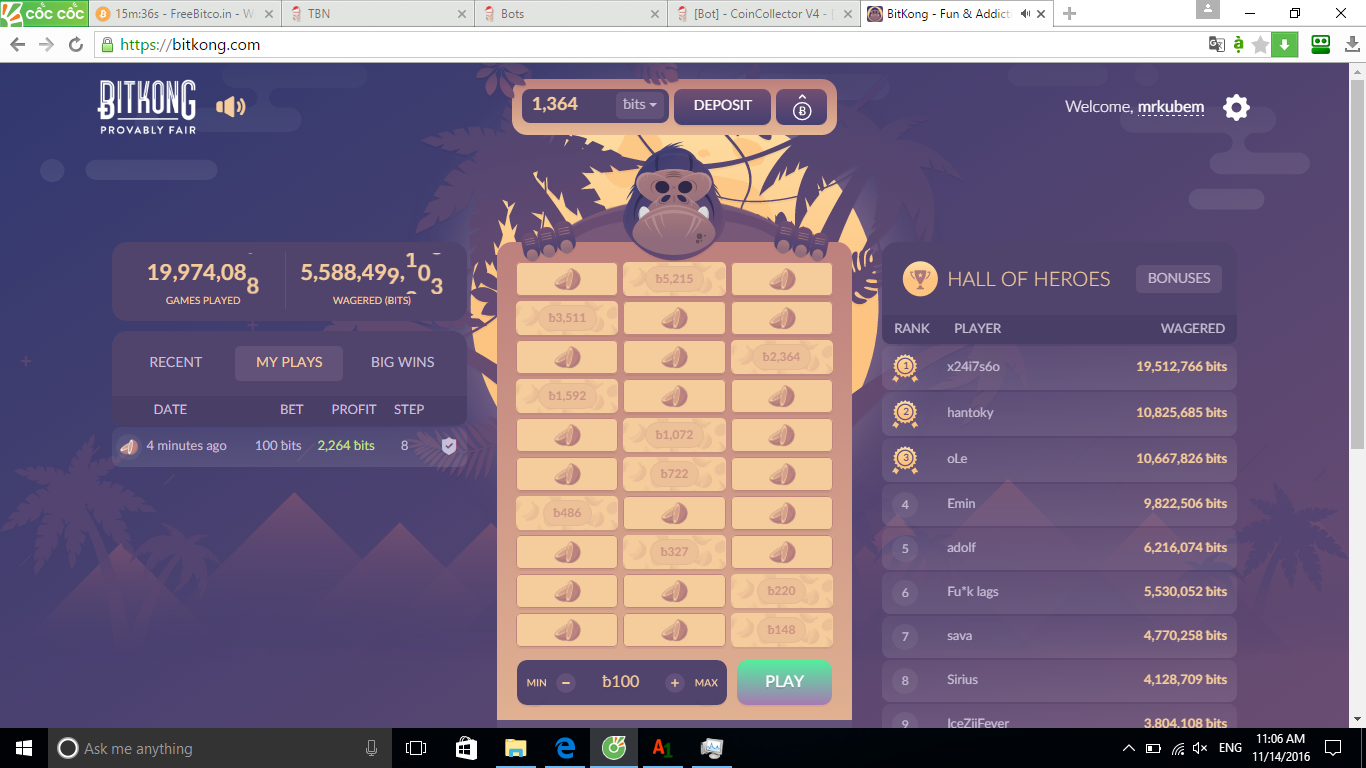 chơi thua hết thì kéo xuống thấy chữ get free bitcoin đó. bấm vào đó. 10 phút nó cho 20bits. cứ như vậy tạo nhiều acc mà chơi.thớt chụp hình chỉ rõ cách chơi cho anh em vs... (ref theo thớt rầu đoá)