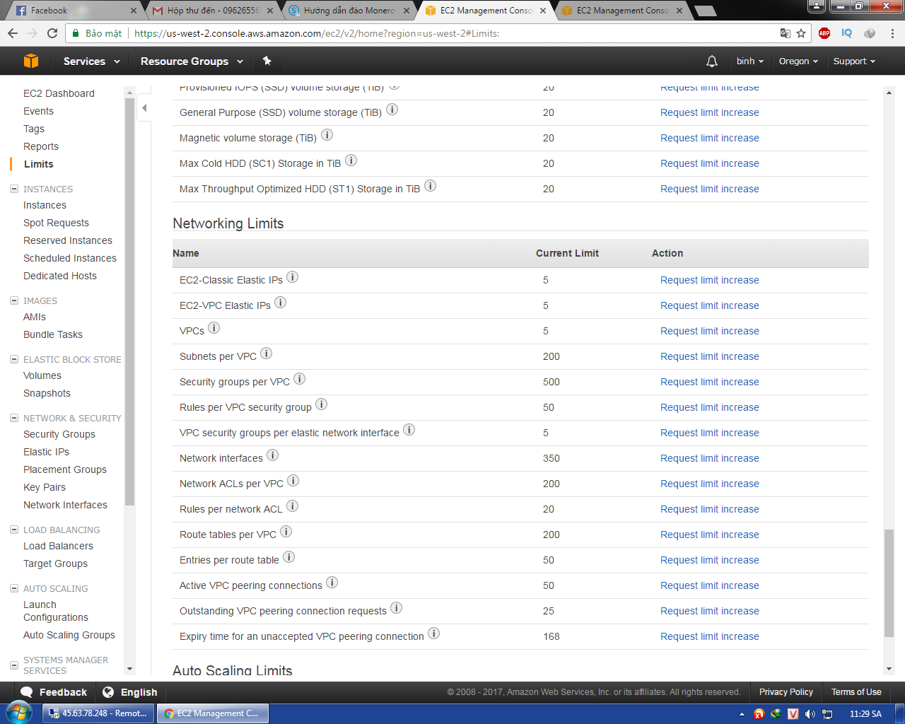 ec2-> limits bên menu bên trái.Đổi region trên topbar bên phải, đổi từng cái để xem.Hên hên nó mở hết thì 1 đêm ngủ dậy có vài triệu.