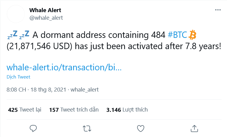 Theo dữ liệu từ công cụ theo dõi giao dịch tiền mã hóa Whale Alert, một người dùng ẩn danh đã kích hoạt lại ví chứa 484 đồng BTC vào ngày 18/8. So với giá hiện tại, số lượng Bitcoin này có giá hơn 22 triệu USD.