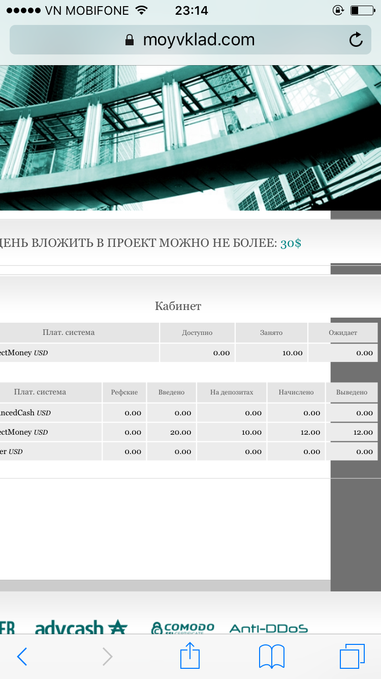 Kế hoạch thay đổi rùi. Mỗi 12 ngày cho phép dep thêm 10$. Vậy Dep 10$ trong vòng 1 tháng bạn dc 16$ + RCB nữa.ROI 120%, Tính ra lãi suất có 2% daily.Nếu bạn Dep dc nhiều hơn thì nên dep nhé. site này nó kg cho dep nhiều mà thay đổi theo lịcch để dep. Nếu bạn đã chơi revshare bạn sẽ rỏ. Vậy khá an toàn mà chiến nhé !Đã hết 12 ngày, đã dep lại 10$, U10650984. Sao gói kích hoạt vẫn 10$ vậy bác, e tưởng được + thêm 10$ chứ