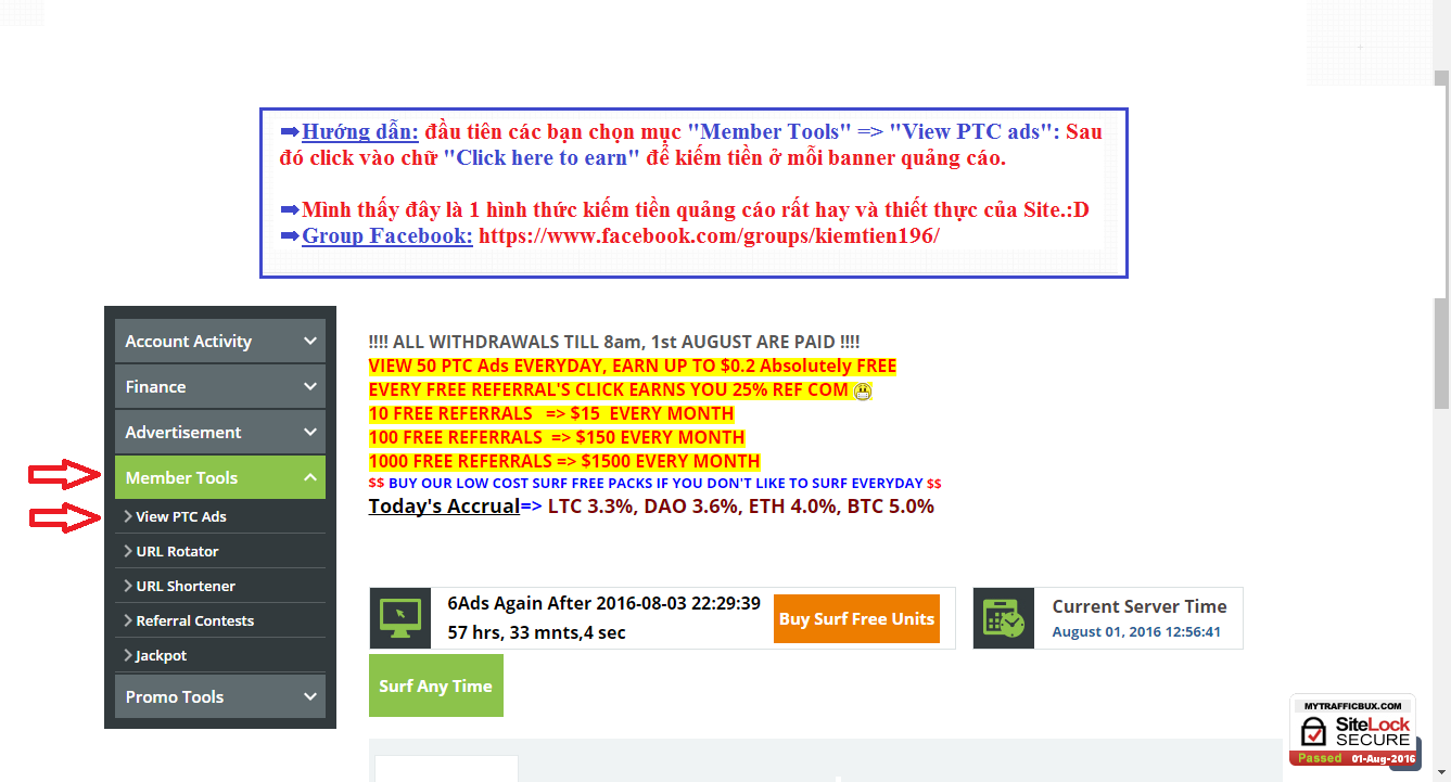 Đầu tiên các bạn chọn mục "Member Tools" => "View PTC ads"